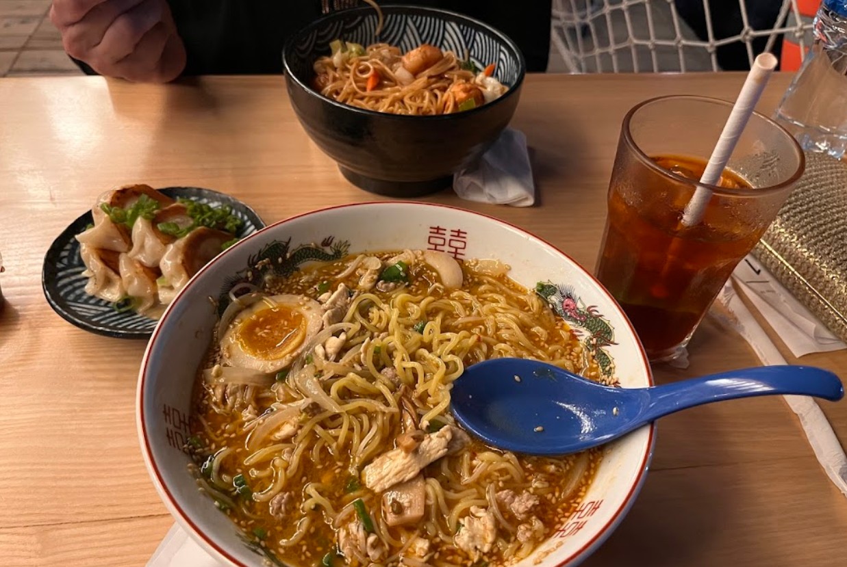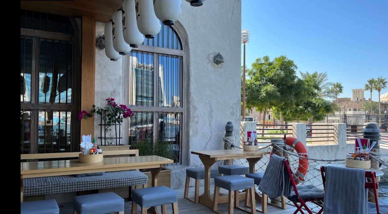 Wir suchen die nächste Abrastation in der Nähe auf und fahren mit der Abra wieder zurück nach Bur Dubai. Am Fährterminal Al Fahidi wo wir aussteigen sehen wir eine kleine Terrasse. Vor dem Haus ist ein Eis-Reklameschild zu sehen. Beim Näherkommen entdecken wir das hübsche Speiselokal Wokyo Noodle Bar AL Seef mit einer Chinesisch/Japanischen Küche und der kleinen Terrasse, die wir vorher gesehen hatten.