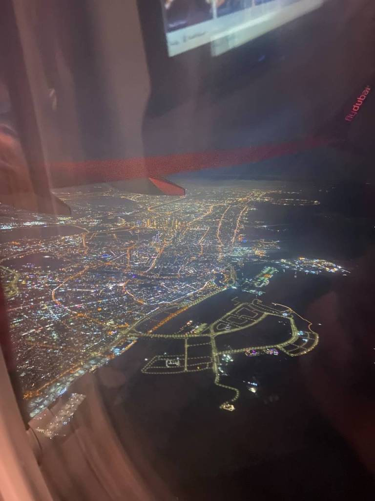 Pünktlich um 14:05 starten wir aus Salzburg. Erfreulicherweise sind in unserer Maschine Bildschirme in die Rückenlehnen der Vordersitze eingebaut. So können wir uns immer Informieren auf was für einer Route wir fliegen. Unser Ziel ist der DXB Flughafen in Dubai, und er ist 4.500 Kilometer von uns entfernt. Die Ankunftszeit liegt bei 23:00 Ortszeit. Wir fliegen über Ungarn/Debrezen passieren kurz darauf die Rumänische Grenze, fliegen über Siebenbürgen und Sibu (Hermannstadt) weiter geht es über Bukarest bevor wir wieder Rumänien verlassen. Danach geht es über das Schwarze Meer, bevor wir irgendwo bei Samsun das Türkische Festland erreichen. (bei unserer Rückreise habe ich ein paar Screenshot vom Bildschirm gemacht). Weiterhin fliegen wir zwischen dem Van-See und dem Berg Ararat (bekannt aus der Bibel, Arche Noah) vorbei. Wenig später überfliegen wir den Iran, was mich ein wenig verwundert, unter uns das Zagros-Gebirge mit seinen bis zu seinen über 4.000 m hohen Bergen, die schneebedeckt sind. So geht es weiter über den Iran bis wir kurz vor 23:00 im Anflug auf Dubai sind.