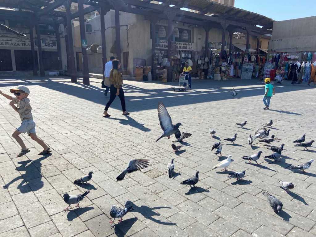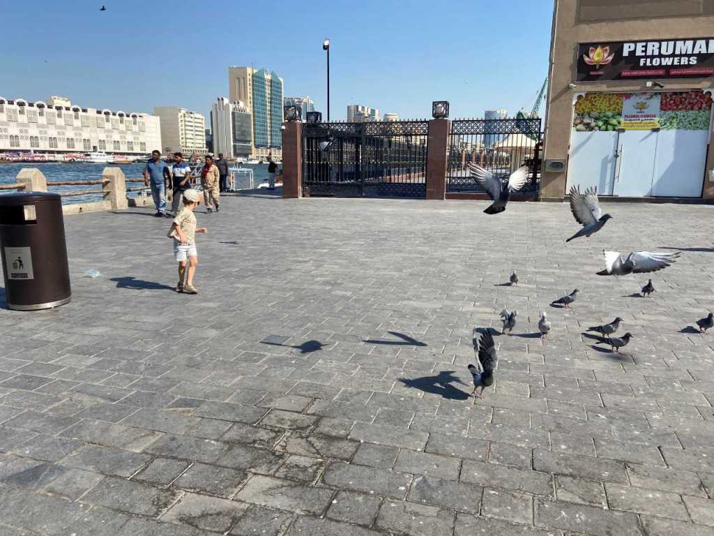 Unser Taxi-Fahrer bringt uns in die Altstadt Al Fahidi wo wir aussteigen, hier ist aber nicht die Abra-Station wie von mir geplant. Wir gehen weiter am Creek entlang, an einem kleinen Platz geht unser Enkel auf Tauben-Jagd, ein beliebtes Hobby von ihm. Wenig später gehen wir durch den Old Souk von Bur Dubai, bis wir die mir bekannte Abra-Station erreichen. Hier ist erstaunlicherweise im Moment nichts los.