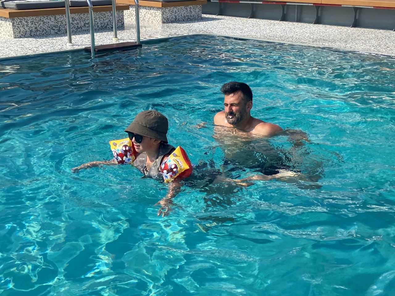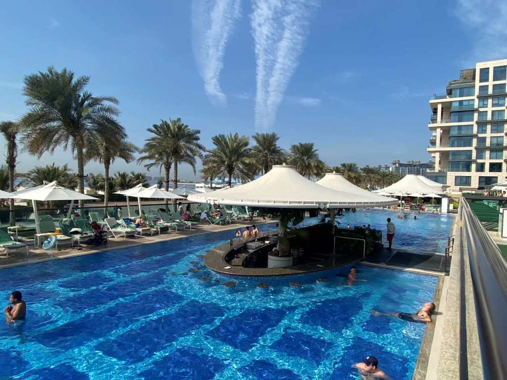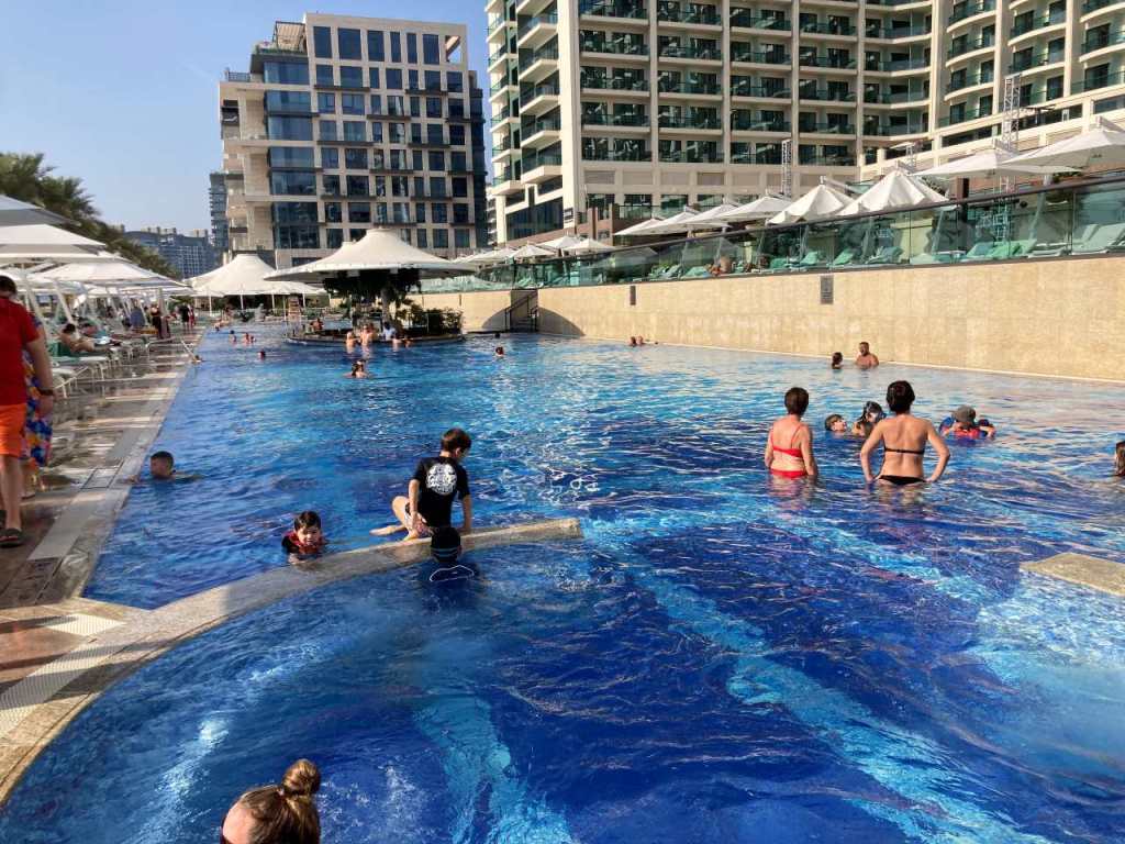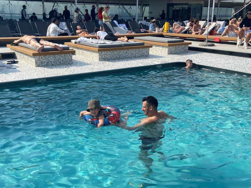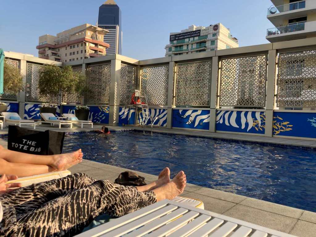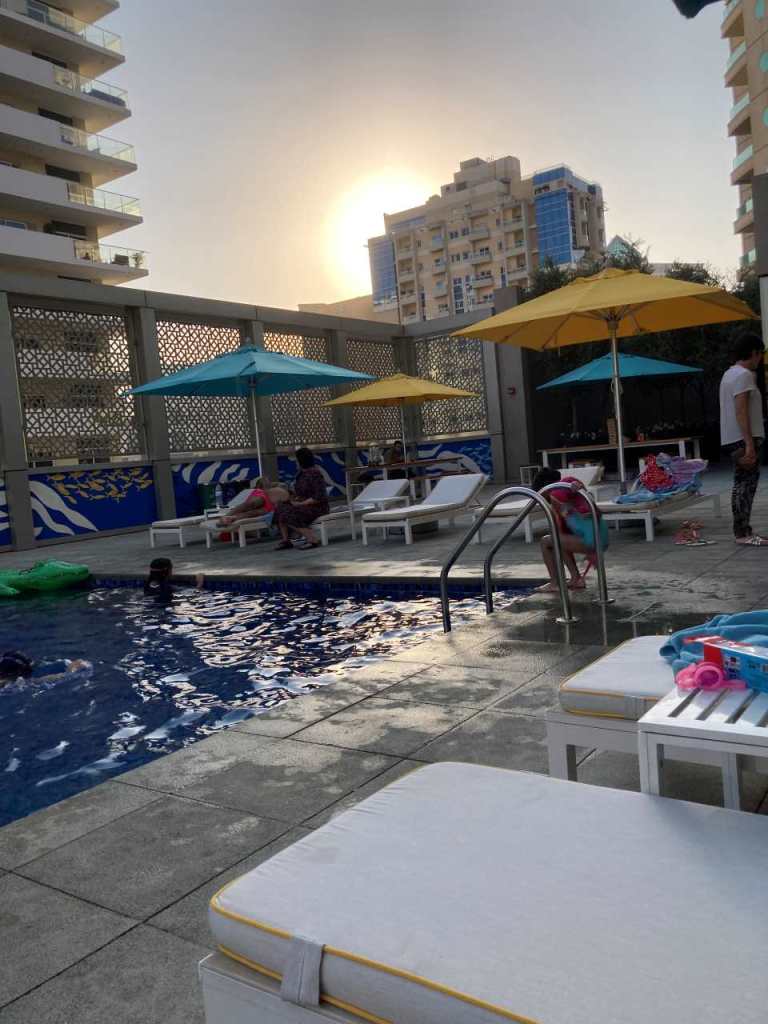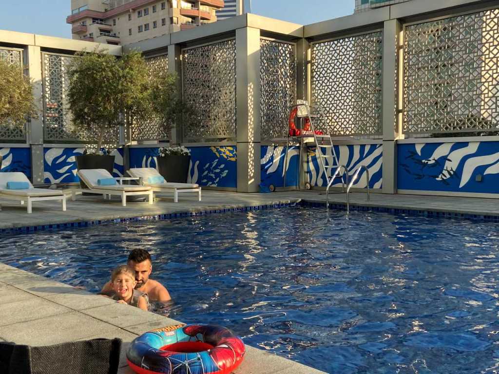 Mit dem Taxi, das bald darauf kommt, fahren wir zu unserem Rove Healthcare City Hotel zurück. Wir gehen alle zum Umziehen in unsere Zimmer zurück, im Anschluss wollen wir zum Pool, der sich in einer Art Hochparterre befindet. Hier tummeln sich Vater und Sohn im warmen Wasser des Hotelpools. Schade nur, dass bald darauf die Sonne hinter dem nächsten Hochhaus verschwindet.
