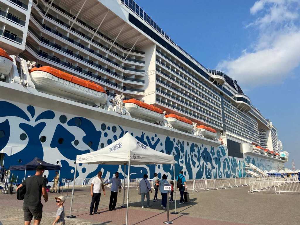 Danach geht es zum Einchecken, in langen Reihen warten hier die Angestellten von MSC Cruises die an Bord ihren Dienst tun, um unsere Papiere zu prüfen und die Bordausweise ausstellen. Und dann stehen wir vor dem Riesenschiff.