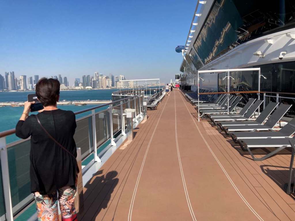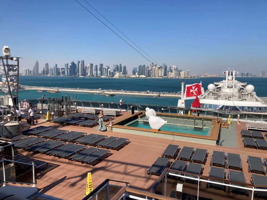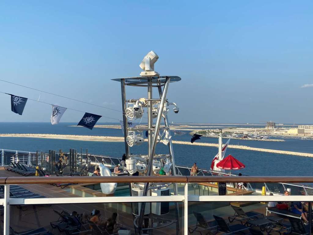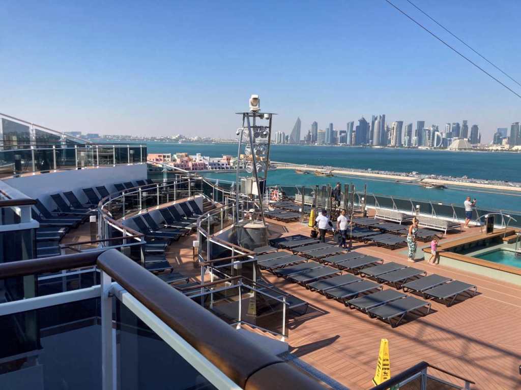 Wir sind froh wieder an Bord zu sein, nach unserem ach so erfolgreichen Ausflug in Doha !!. Nachdem wir unsere Sachen auf die Kabine gebracht haben, fahren wir hinauf zum Pool auf Deck 15. Nachdem viele Gäste heute auf einem Ausflug sind, stehen viele Badeliegen zur Verfügung. An der Atmosphere Bar South holen wir uns einen Teller mit Pommes und einer Pizzasscheibe, Hier gibt es dreierlei Sorten der äußerst schmackhaften Pizzen. So verbringen wir den restlichen Nachmittag in der warmen Sonne. Gegen 18:00 gehen wir zurück in unsere Kabinen. Auf Wunsch meiner Tochter haben wir die Essenszeiten geändert von 17:30 auf 19:30, mal sehen wie das klappt.