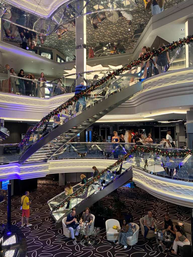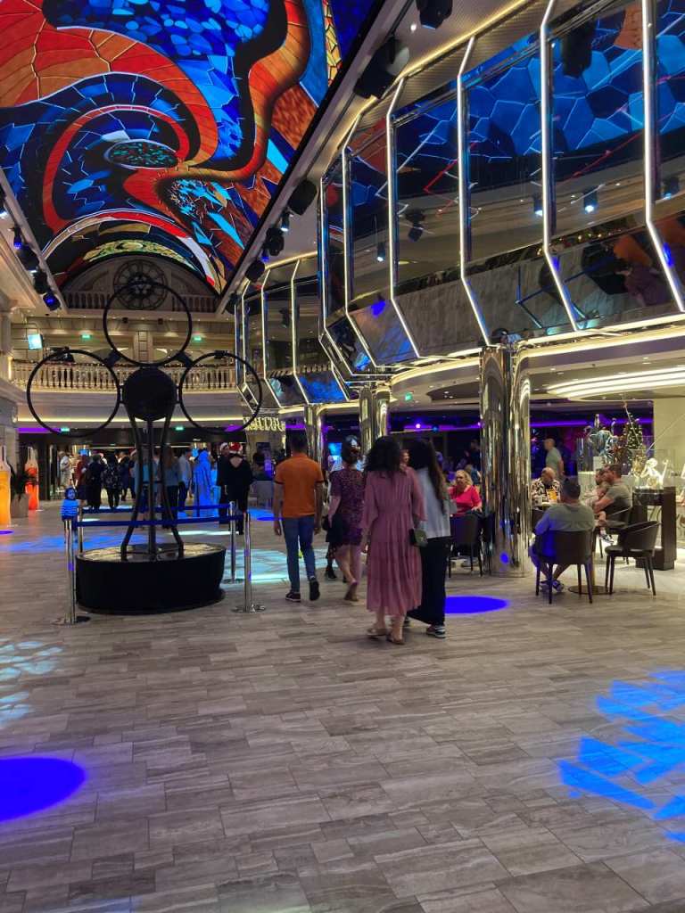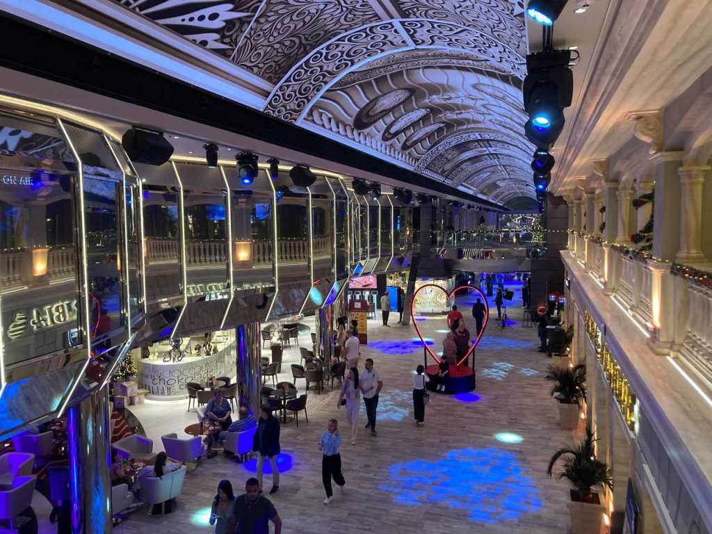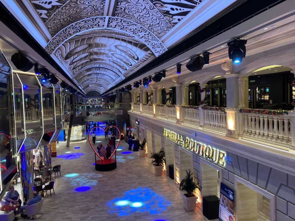Die Galeria mit ihrem 112 Meter langen Led-Himmel auf Deck 6 und 7 ist im vorderen Bereich des Schiffes, das heißt vom Delphi-Theater bis zum Atrium mit Bar`s und verschiedenen Bezahl-Restaurant bestückt. Vom Atrium bis nach hinten am Heck befindet sich das Casino und eine weitere schöne Tanzbar Carousel Lounge, sie wurde in der Vergangenheit nur für besondere Shows benutzt. Sie kann mittlerweile von den Passagieren ganztags benutzt werden, Als wir im Laufe der Woche einmal die Carousel Lounge aufsuchten war aber sie ohne weitere Gäste.