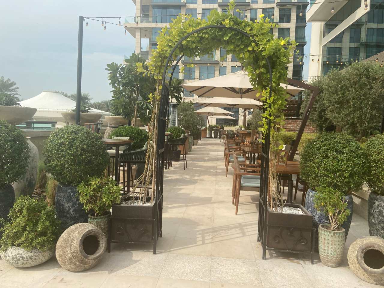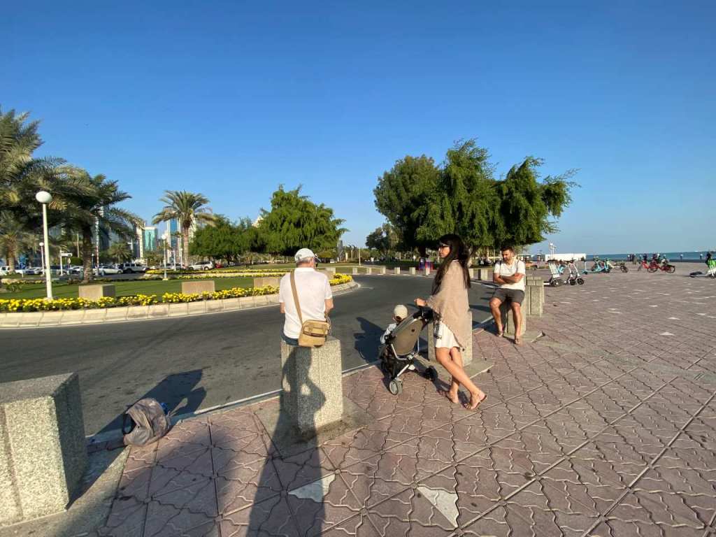 Wir verlassen die große Mall und versuchen zurück auf die Ufer-Corniche zu kommen. Das wurde leider eine längere Geschichte, weil alle Straßen immer parallel zur Corniche führen. Aber irgendwann hat es doch geklappt, wir verlassen zwischen dem Doha Tower und dem QP Tower das Qatar Petroleum District. Direkt an der Corniche befindet das Twisted Olive & Naama`s Garden (Garten-Lokal) das sich zum Verweilen einladet.