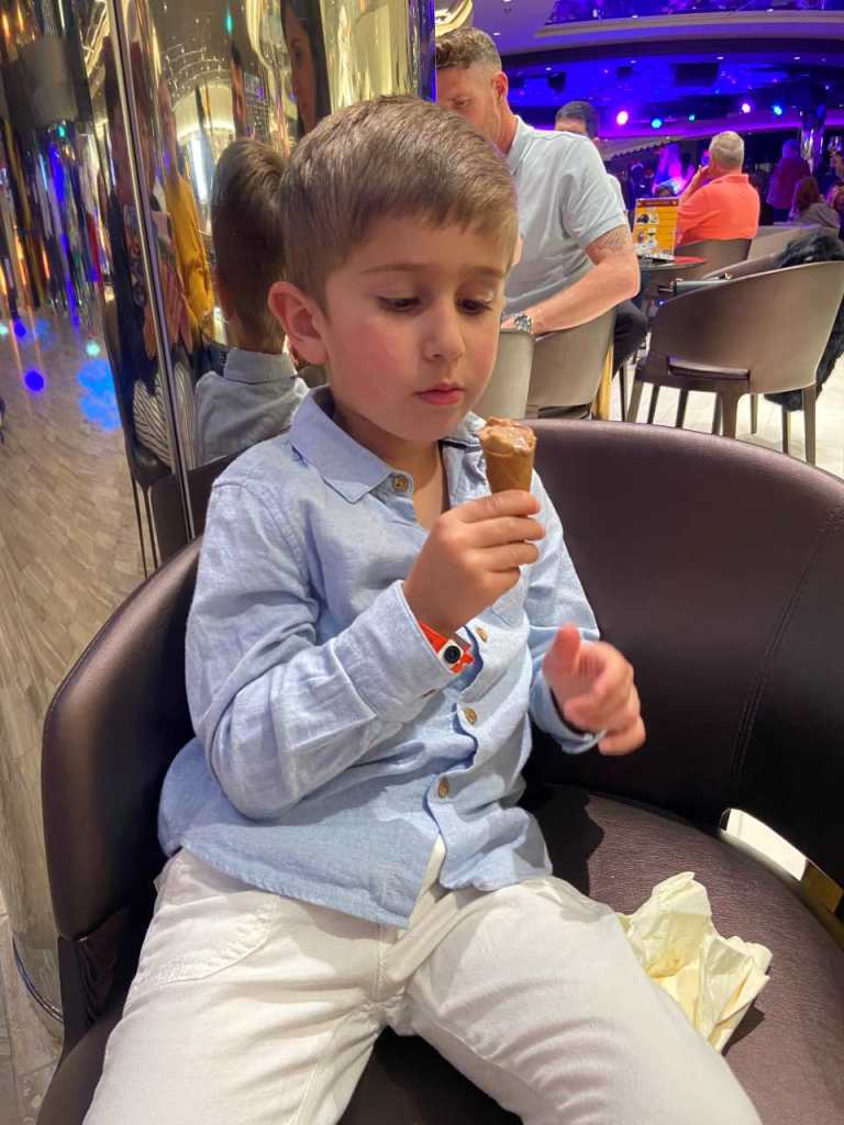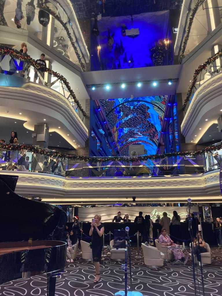 Das heißt wir werden heute Morgen etwas früher als sonst zum Speisesaal auf Deck 15 gehen. Wir müssen noch ein wenig auf unsere Jungen warten, heute Morgen stehen zum ersten Mal freie Sitzplätze im Atrium zur Verfügung, während der ganzen Kreuzfahrtwoche waren niemals Sitzplätze frei.