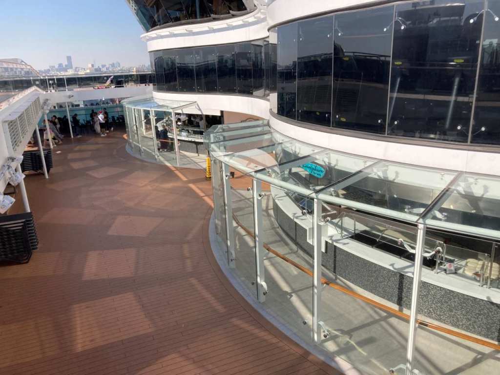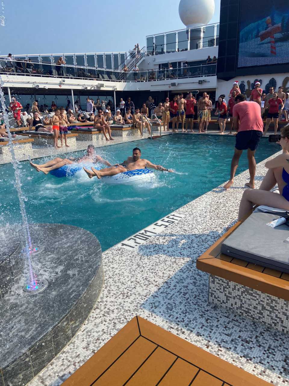 Wir verbringen die nächsten Stunden hier am Pooldeck. Zeitweise machen die Bord-Animateure Ratespiele über ihren großen Bildschirm, der an einem Ende des Pooldecks vor dem Indoor-Pools ist. Hier geht es um Teile von bekannten Symbolen, oder Formel 1 Rennstrecken oder vieles andere. Nach der Rätselrunde gibt es jeden Tag einen Tanz-Unterricht in Salsa oder anderen Tänzen, dazu finden sich immer viele Interessenten die hier mit machen. Irgendwann am Nachmittag mache ich mich auf den Weg über Bord, um noch ein paar Bilder vom Schiff zu machen.