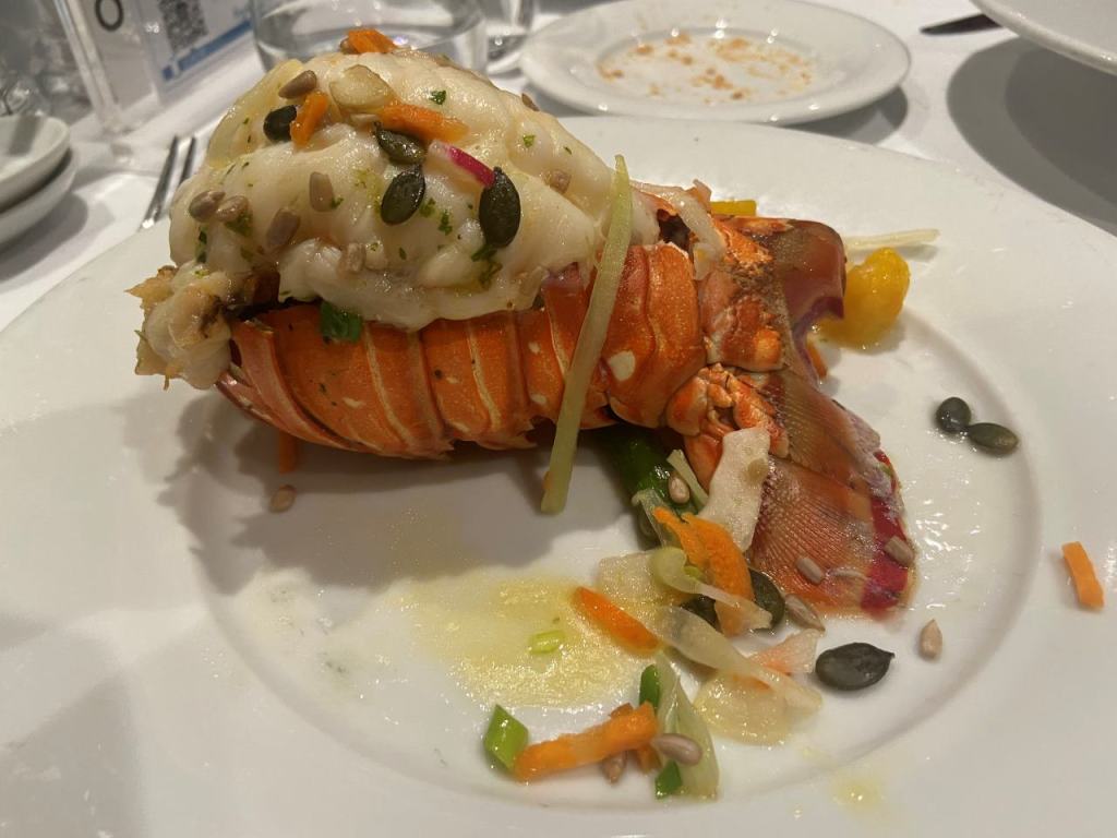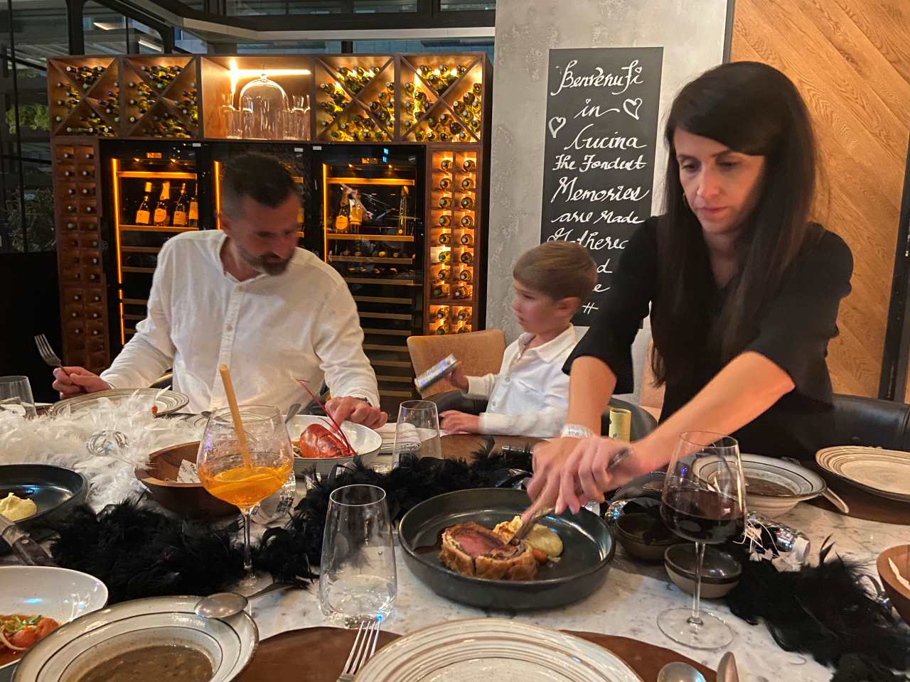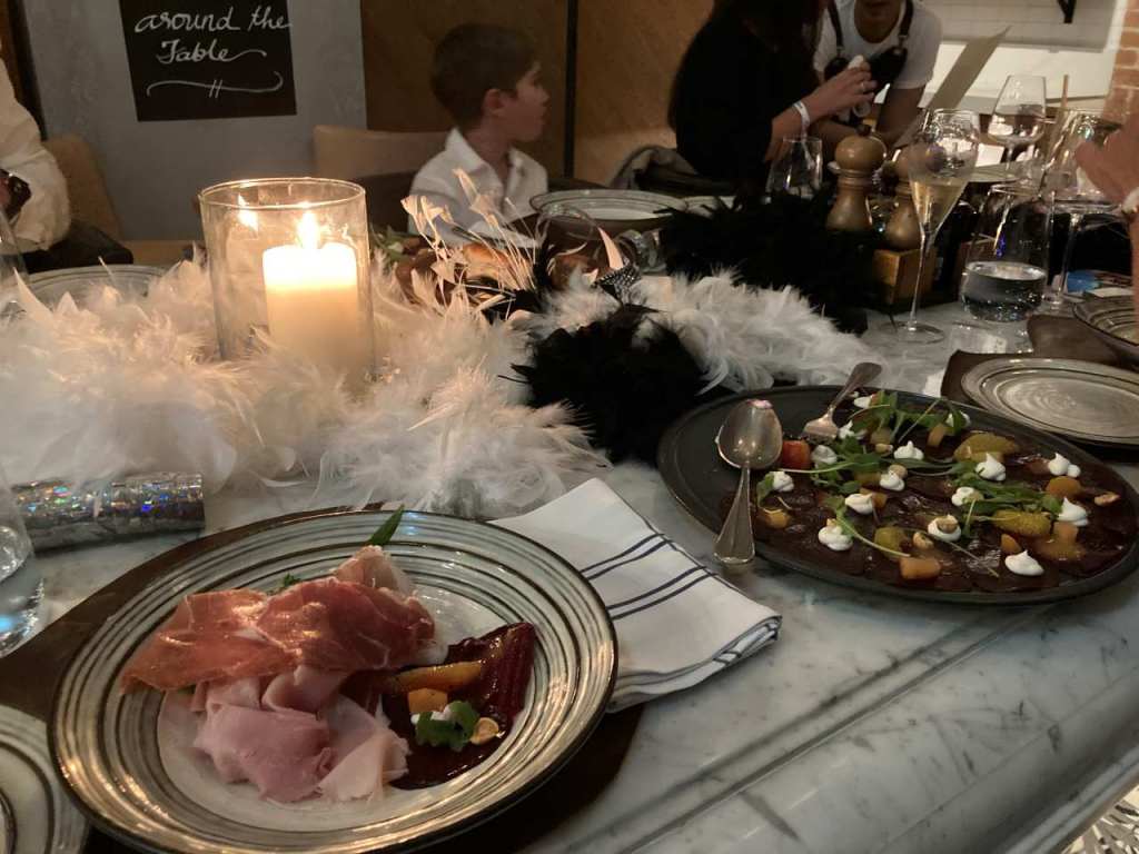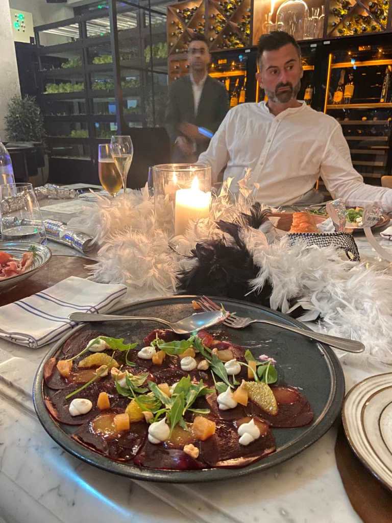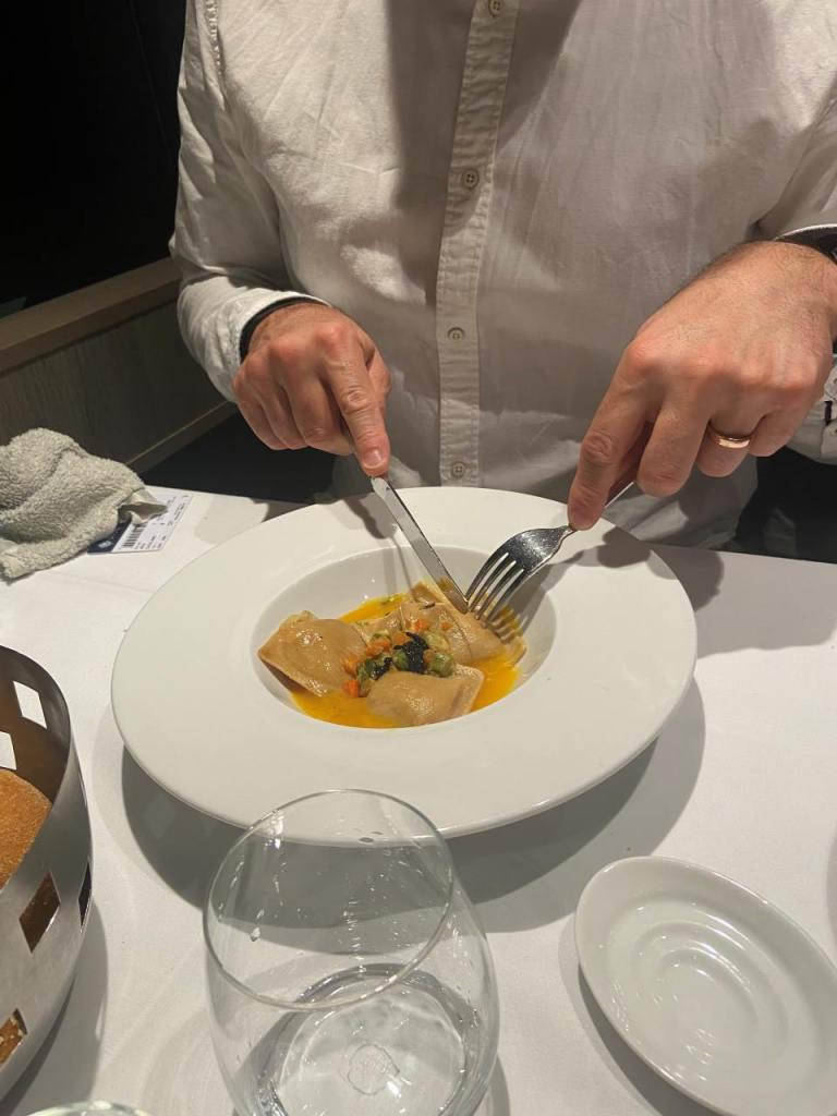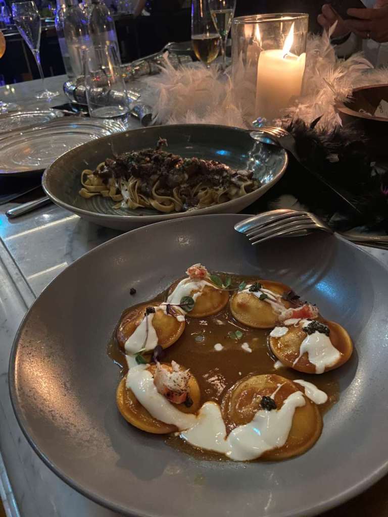 Nach unserem Sekt-Empfang am Eingang trinken wir je nach Person Cocktails, Aperol Spitz, Bier, Wein oder Sekt und Softdrinks oder auch Wasser. Begonnen hat unser 5 Gänge Menü mit einem Rote Beete Carpaccio mit Früchte und Käse garniert. Dazu gab es eine Schinkenplatte mit rohem und gekochten Schinken garniert mit Oliven. Als zweiten Gang gibt es Tagliatella mit Pilzen und Rahmsoße, als weiteres Tortellini mit irgendeiner Cremesauce. Der dritte Gang begann mit Hummer und Rinderfilet mit einer Art Blätterteig, Kartoffelbrei und noch etwas. Anschließend eine Linsensuppe. Der nächste Gang besteht aus Tiramisu und Pana Coppa dazu einen Teller mit kleinen Törtchen, Windbeutel oder Ähnliches.