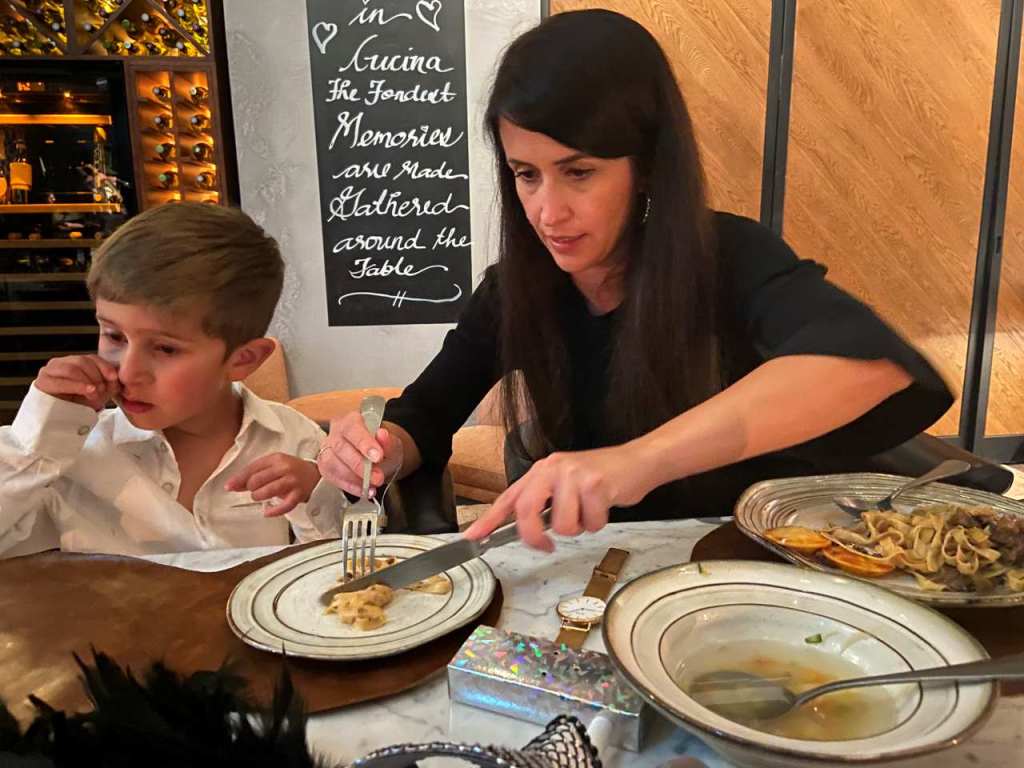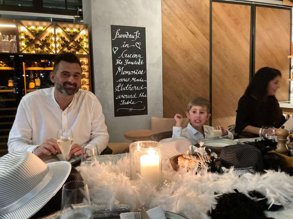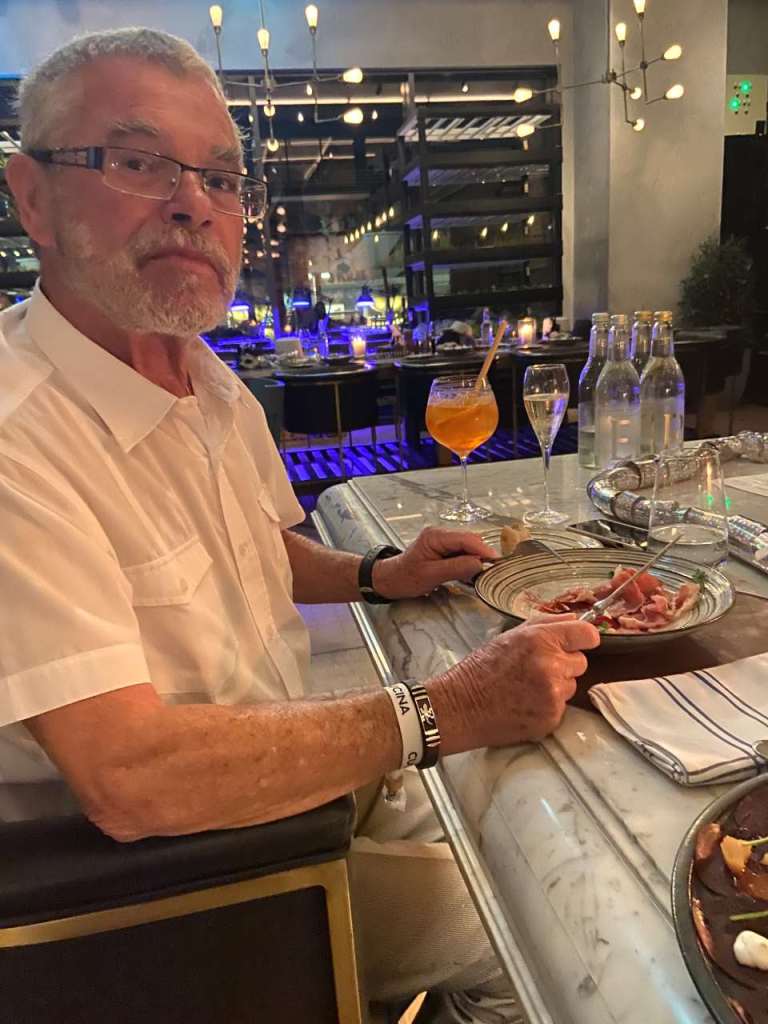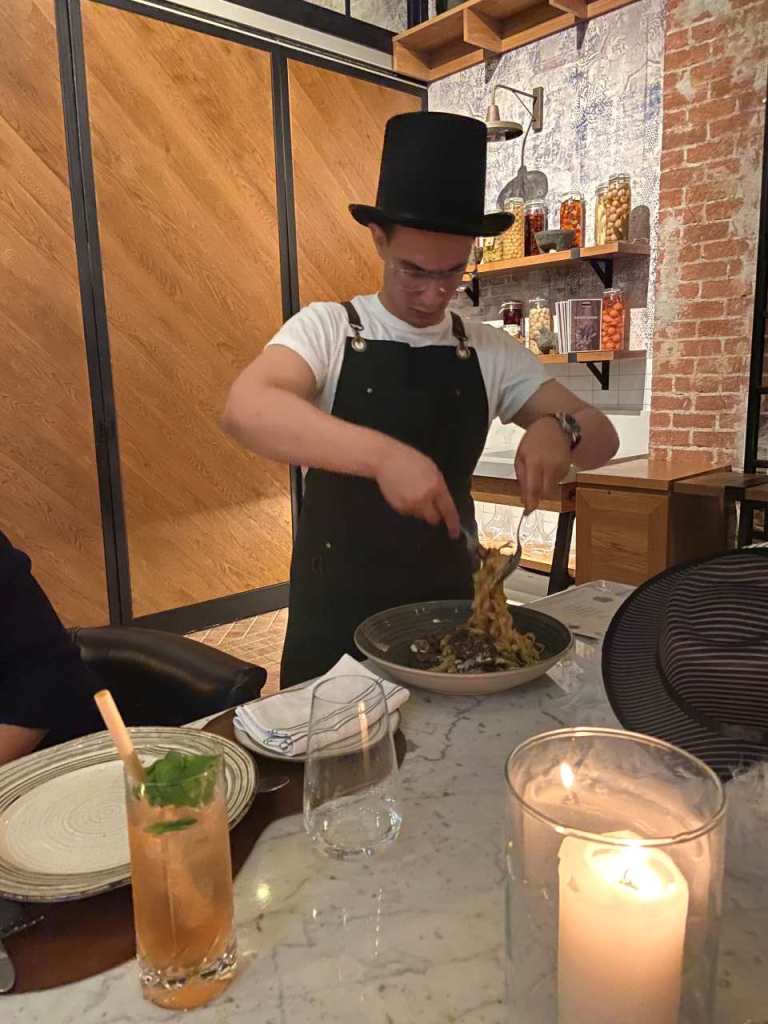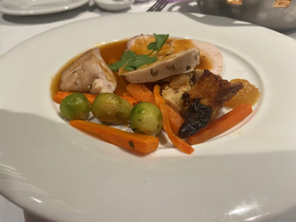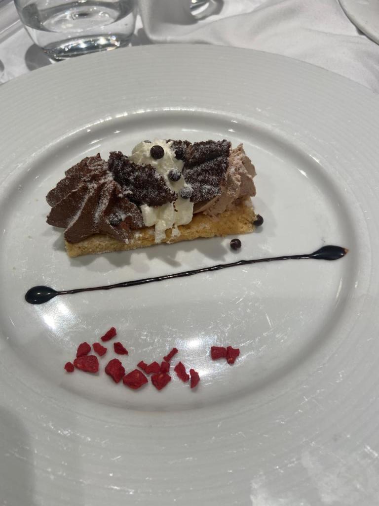 Nach unserem Sekt-Empfang am Eingang trinken wir je nach Person Cocktails, Aperol Spitz, Bier, Wein oder Sekt und Softdrinks oder auch Wasser. Begonnen hat unser 5 Gänge Menü mit einem Rote Beete Carpaccio mit Früchte und Käse garniert. Dazu gab es eine Schinkenplatte mit rohem und gekochten Schinken garniert mit Oliven. Als zweiten Gang gibt es Tagliatella mit Pilzen und Rahmsoße, als weiteres Tortellini mit irgendeiner Cremesauce. Der dritte Gang begann mit Hummer und Rinderfilet mit einer Art Blätterteig, Kartoffelbrei und noch etwas. Anschließend eine Linsensuppe. Der nächste Gang besteht aus Tiramisu und Pana Coppa dazu einen Teller mit kleinen Törtchen, Windbeutel oder Ähnliches.
