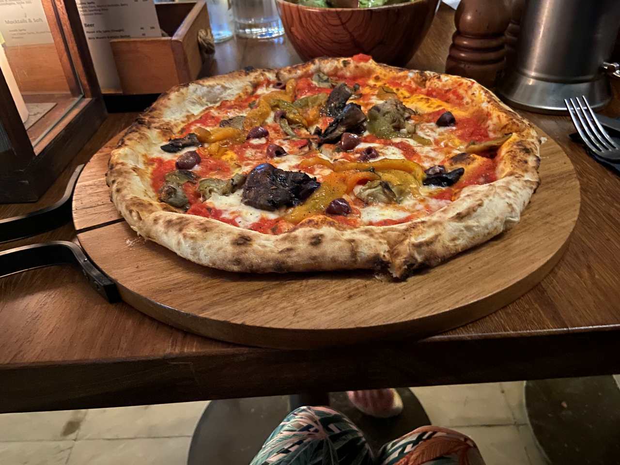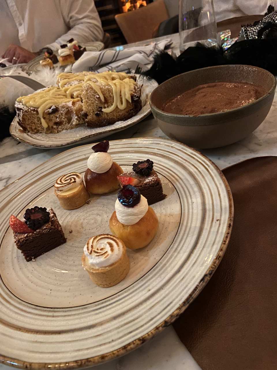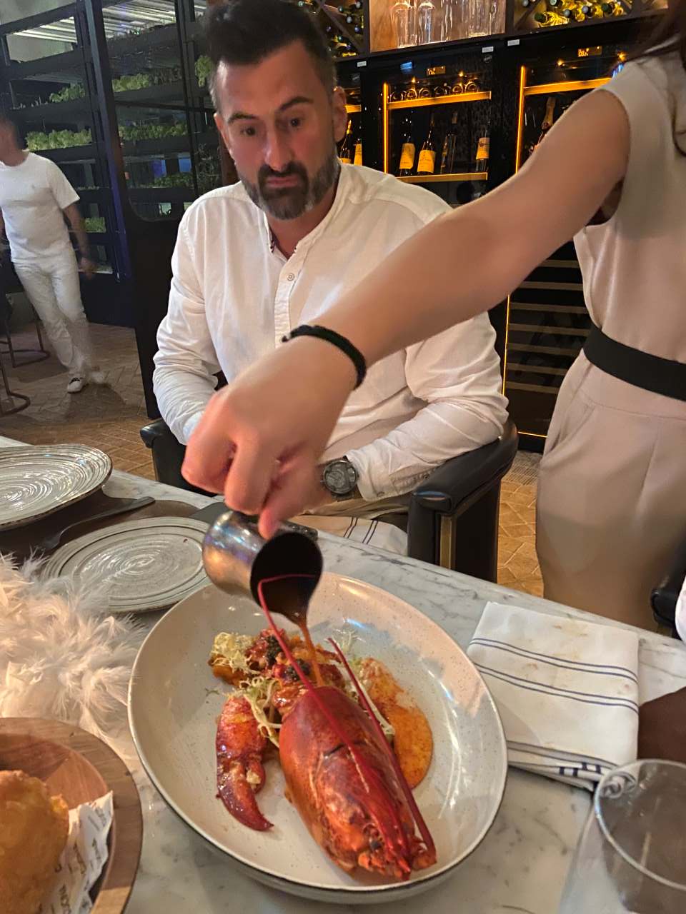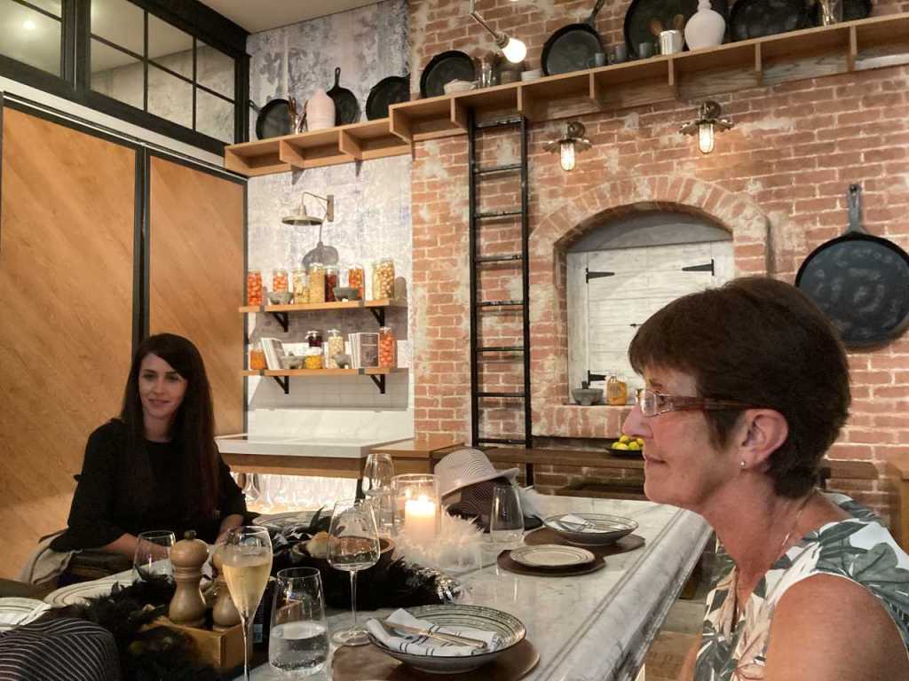 Nach unserem Sekt-Empfang am Eingang trinken wir je nach Person Cocktails, Aperol Spitz, Bier, Wein oder Sekt und Softdrinks oder auch Wasser. Begonnen hat unser 5 Gänge Menü mit einem Rote Beete Carpaccio mit Früchte und Käse garniert. Dazu gab es eine Schinkenplatte mit rohem und gekochten Schinken garniert mit Oliven. Als zweiten Gang gibt es Tagliatella mit Pilzen und Rahmsoße, als weiteres Tortellini mit irgendeiner Cremesauce. Der dritte Gang begann mit Hummer und Rinderfilet mit einer Art Blätterteig, Kartoffelbrei und noch etwas. Anschließend eine Linsensuppe. Der nächste Gang besteht aus Tiramisu und Pana Coppa dazu einen Teller mit kleinen Törtchen, Windbeutel oder Ähnliches.
