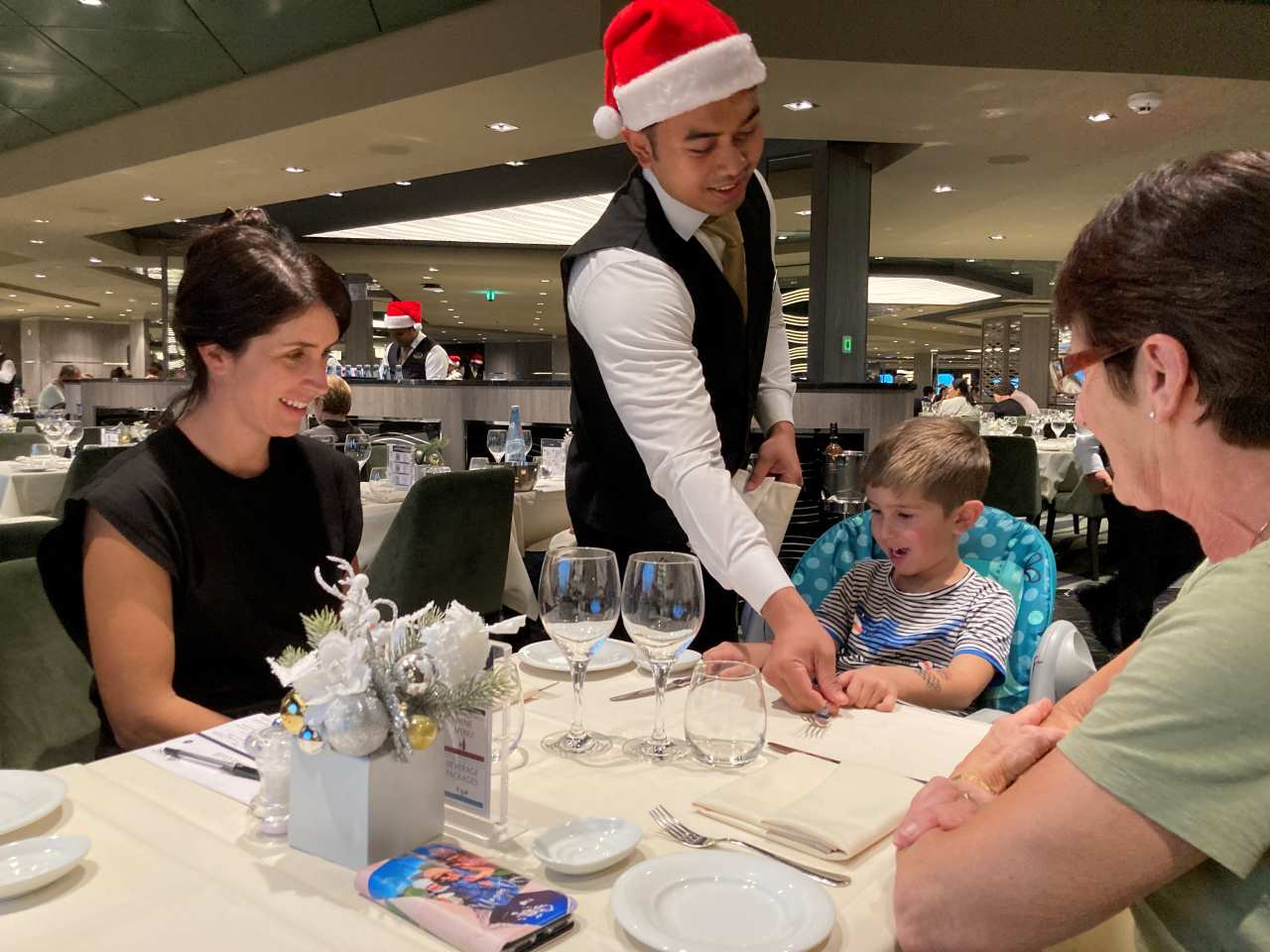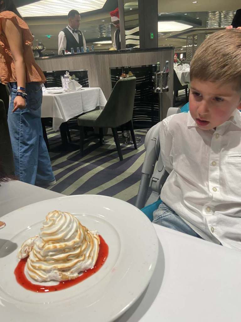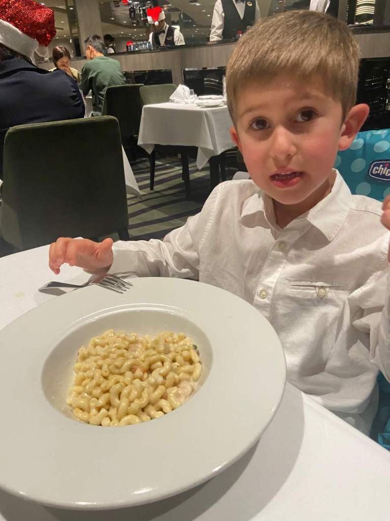 Wir haben die erste Tischzeit um 17:30 bekommen oder ausgesucht ?. Vor dem Essen haben wir in der Rezeption nachgefragt, ob man mit leichter Kleidung zu Tisch gehen kann (mein Schwiegersohn ist mit kurzer Hose an Bord gekommen), und unsere Koffer sind immer noch nicht da. Es sei kein Problem wird uns versichert. So gehen wir also in leichter Freizeitkleidung in unseren Speisesaal mit dem Originellen Namen Green Orchid. Dieser Speisesaal liegt auf dem gleichen Deck 5 in der Nähe der Rezeption und unseren Kabinen. Wir haben einen Tisch direkt an einem Fenster mit guter Sicht nach draußen, aufs Meer bekommen. Der Stewart der für unseren Tisch zuständig sein soll, ist wahnsinnig nett und freundlich, so wie die meisten hier an Bord, wie wir auf unserer Kreuzfahrt feststellen konnten. Das Essen war meiner Meinung nach nicht überwältigend, ich habe bei der Mein Schiff-Flotte schon besser gegessen. Auch unserem kleinsten schmeckt das Essen nicht so gut.