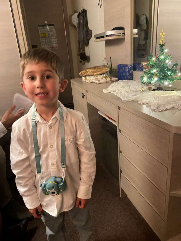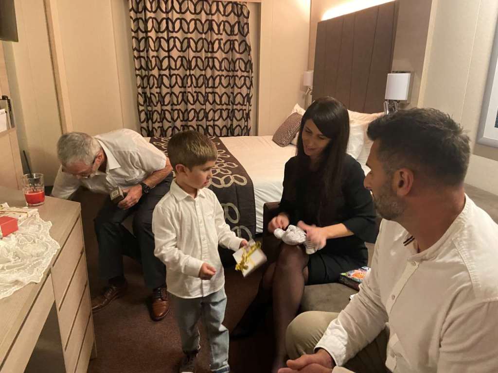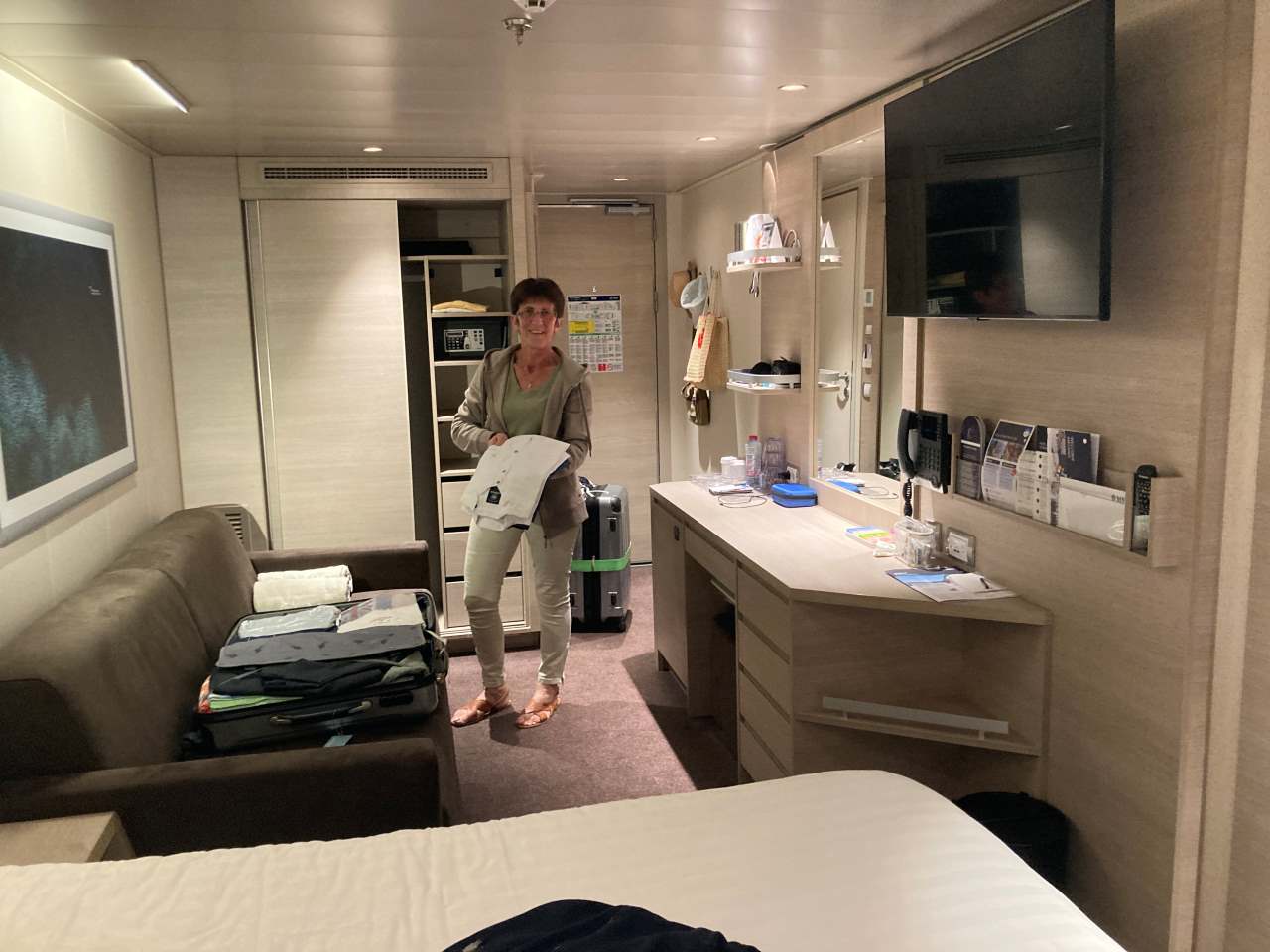 Bis wir in unseren Kabinen ankommen, ist alles schon alles vorbei, ein Kabinenboy gibt für uns über das Telefon den betreffenden Code 881 ein. Wir müssen auf Deck 6 Kontakt mit einer Prüfstelle aufnehmen, damit ist alles erledigt. Wir kennen das Prozedere in verschiedenen Variationen vom Teilnehmen über einen Bildschirm, in einem Restaurant bis hin zum Lauf im Gänsemarsch zu den Rettungsbooten. Nach unserer Registrierung bei der Rettungsübung gehen wir wieder zurück in unsere Kabinen. Unser kleiner Enkel braucht etwas Ruhe, der Tag ist ja noch nicht zu Ende für Ihn. In unserem Kabinengang stehen schon vereinzelt Koffer vor den Kabinentüren, bei uns leider nicht.