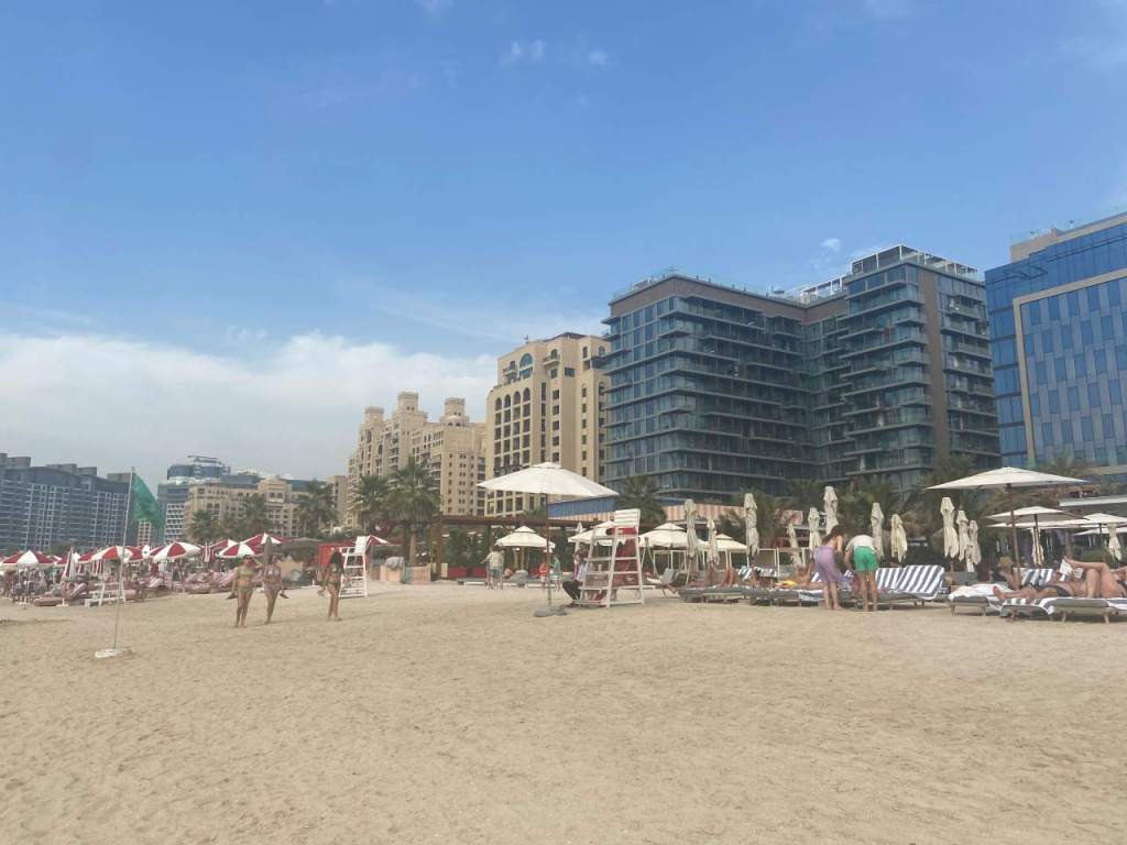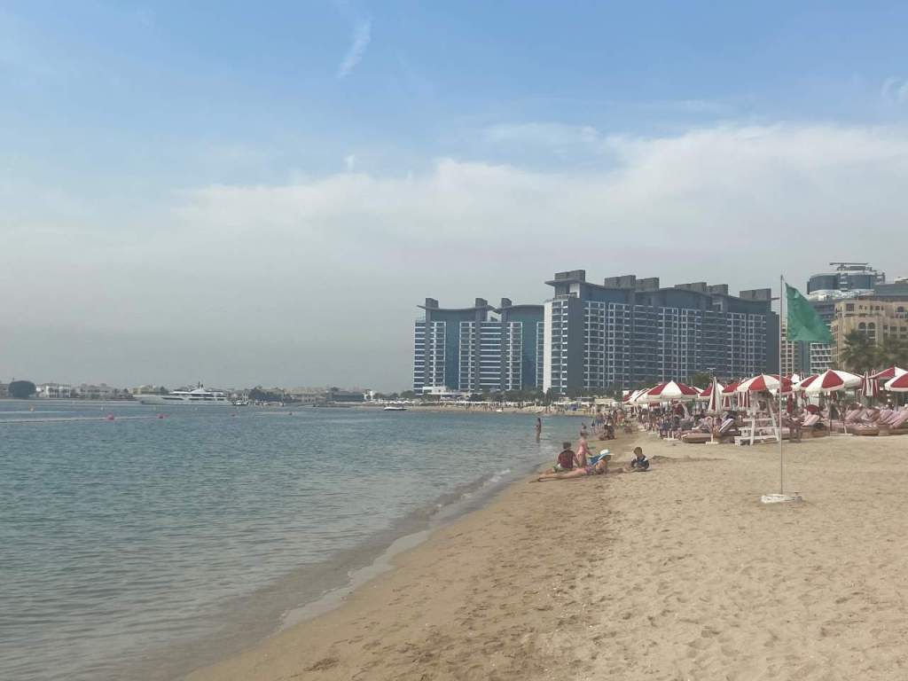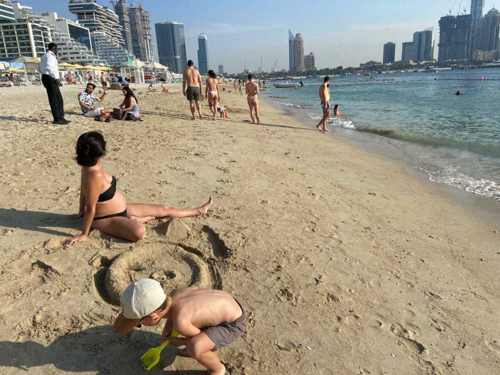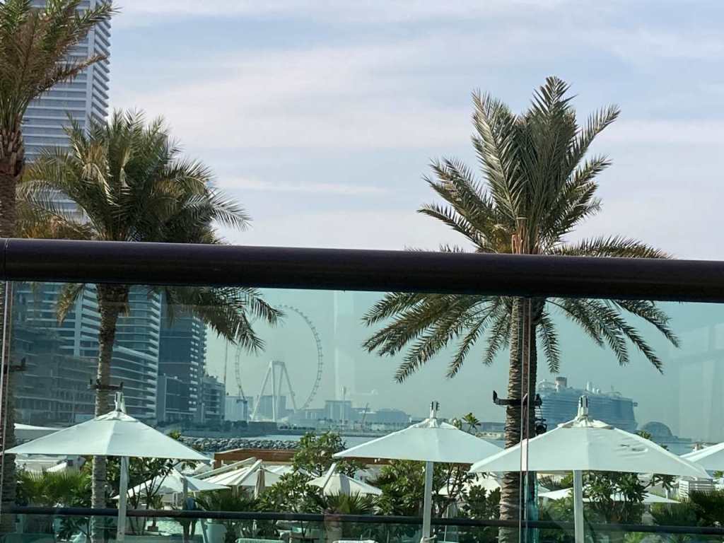 Wenig später gehen wir zum Lunch ins Hoteleigene Restaurant. Wir haben hier im Hotel Halbpension gebucht, können also wählen zwischen Mittag oder einem Abendessen. Nach dem Essen das wir im Außenbereich des Restaurant einnehmen, möchte unsere Tochter und unser Schwiegersohn noch an den Hoteleigenen Strand wechseln, unser Enkel möchte noch im Sand spielen. So gehen wir über die Promenade an den Strand West Palm Beach, der sich am Hotel entlang ca. 1 Kilometer in beiden Richtungen ausdehnt. Ein paar Kilometer entfernt sehen wir auf Bluewater Island die Kulisse des 250 Meter hohen Riesenrades Ain Dubai .