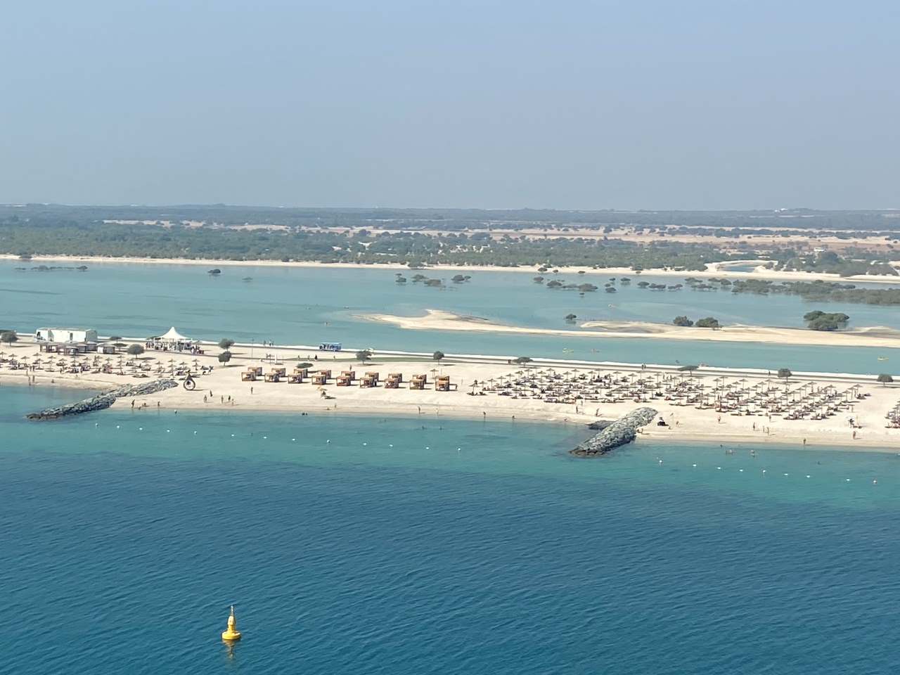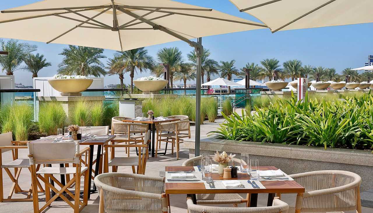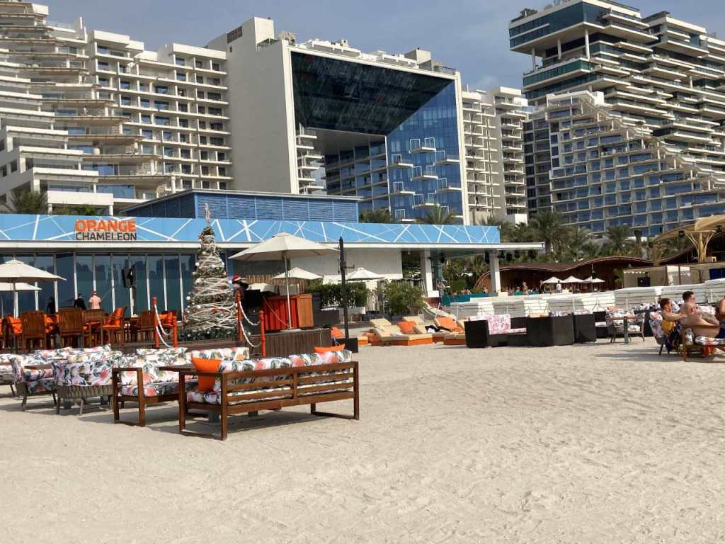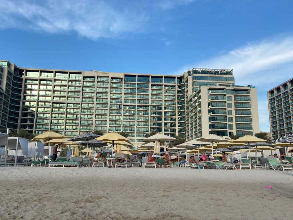 Wenig später gehen wir zum Lunch ins Hoteleigene Restaurant. Wir haben hier im Hotel Halbpension gebucht, können also wählen zwischen Mittag oder einem Abendessen. Nach dem Essen das wir im Außenbereich des Restaurant einnehmen, möchte unsere Tochter und unser Schwiegersohn noch an den Hoteleigenen Strand wechseln, unser Enkel möchte noch im Sand spielen. So gehen wir über die Promenade an den Strand West Palm Beach, der sich am Hotel entlang ca. 1 Kilometer in beiden Richtungen ausdehnt. Ein paar Kilometer entfernt sehen wir auf Bluewater Island die Kulisse des 250 Meter hohen Riesenrades Ain Dubai .