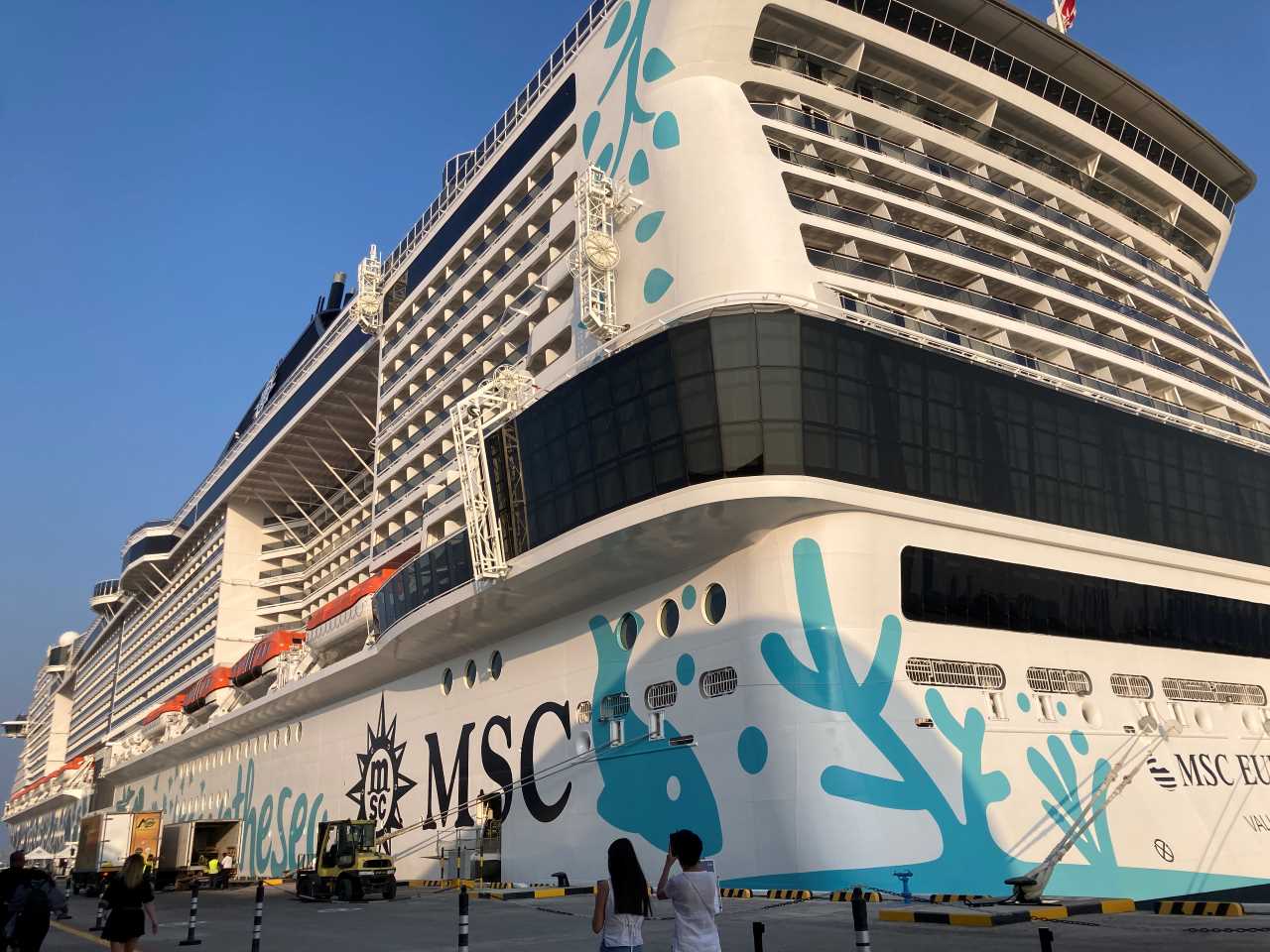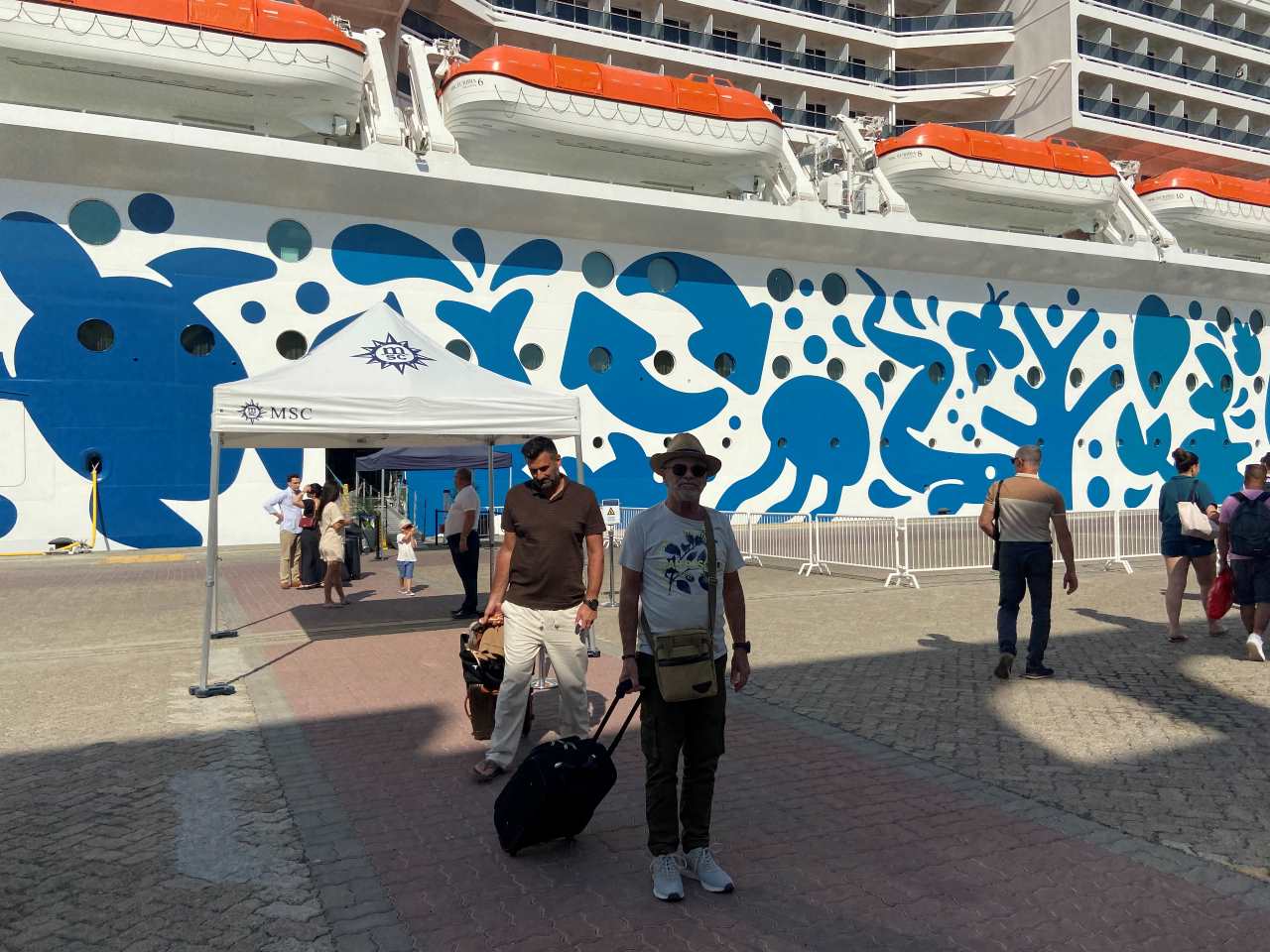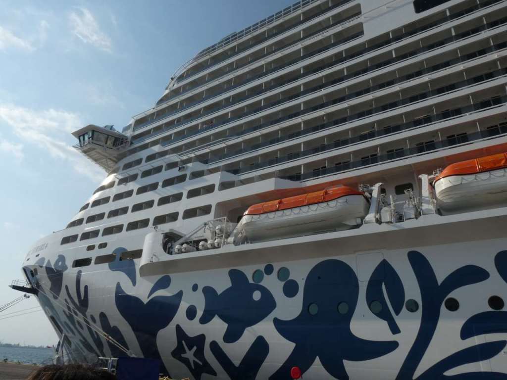 Gegen 12:00 verlassen wir die MSC Euribia, wie gewohnt über Deck 4 mit dem Buggy, den wir in diesem Urlaub mit dabei haben. Hinter uns liegt die Norwegian Dawn an der Pier, sie ist um einiges kleiner als unser Schiff.