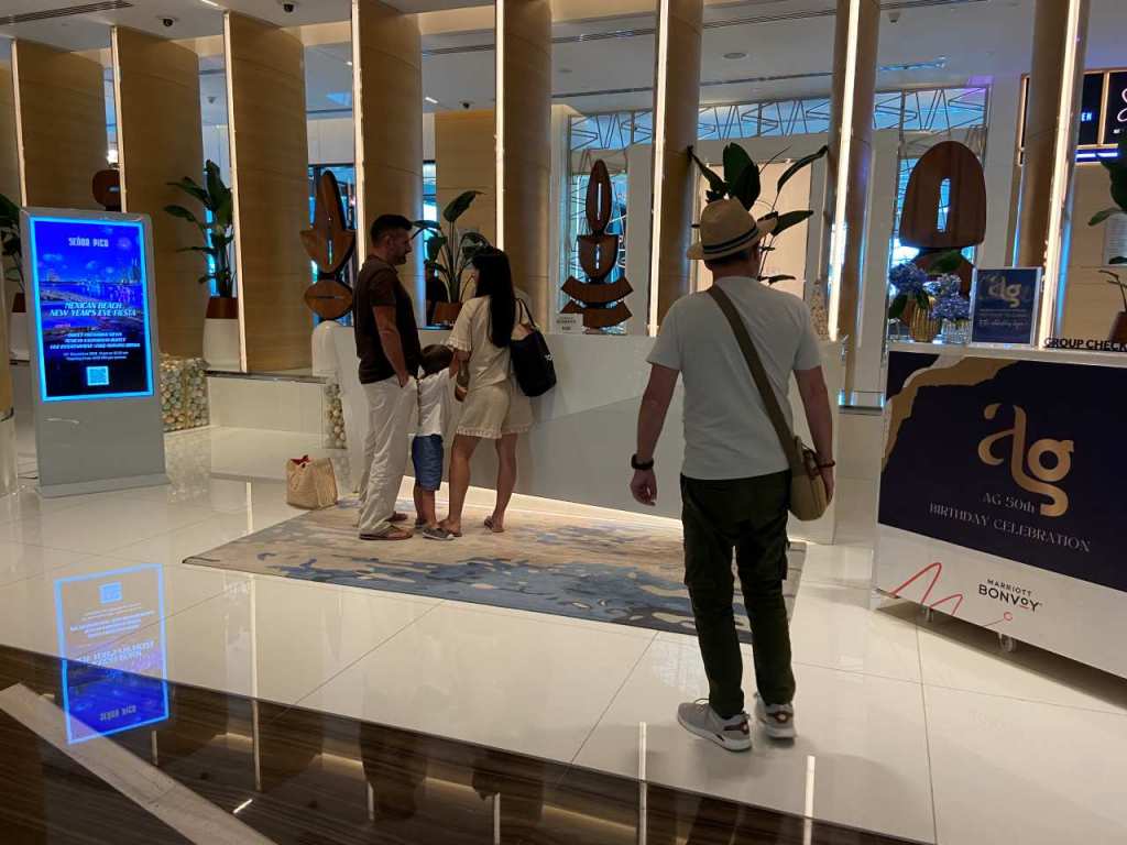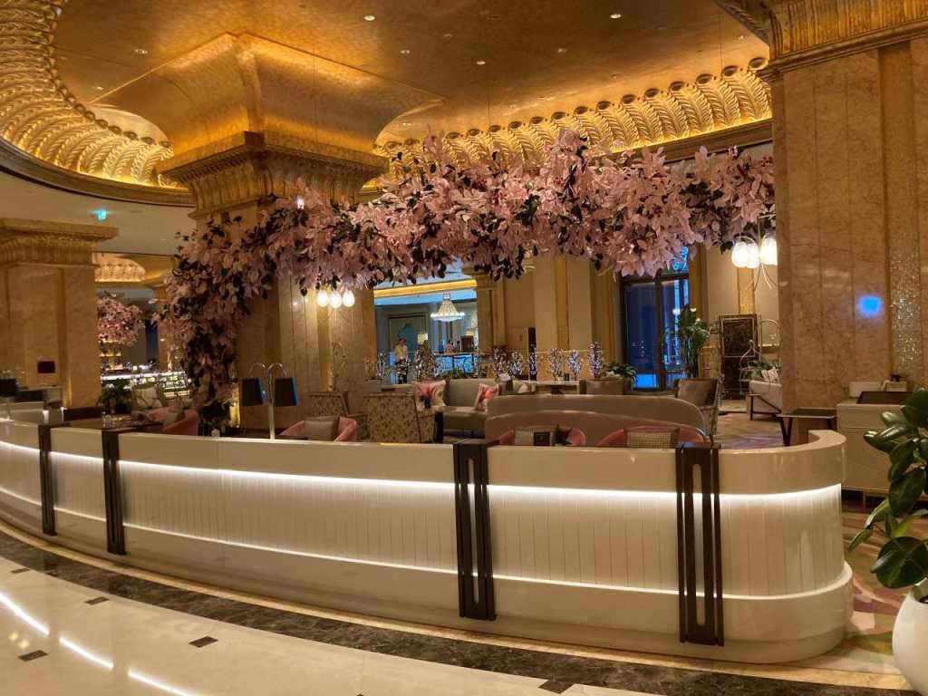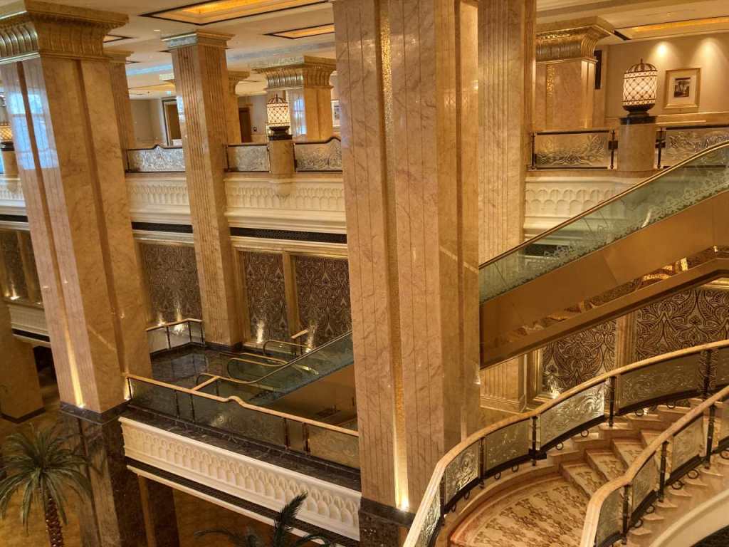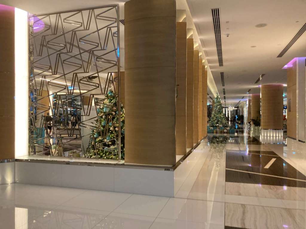Wir gehen durch Teile des Sky View Tower 1 Hotels, vorbei an der Rezeption und der Lobby sowie anderer Räume. Danach fahren wir mit einem Fahrstuhl ein paar Stockwerke nach oben und gehen hier irgendwelche Gänge durchs Hotel entlang, bis wir den richtigen Fahrstuhl der uns zum Sky View Observatory bringt, gefunden haben.