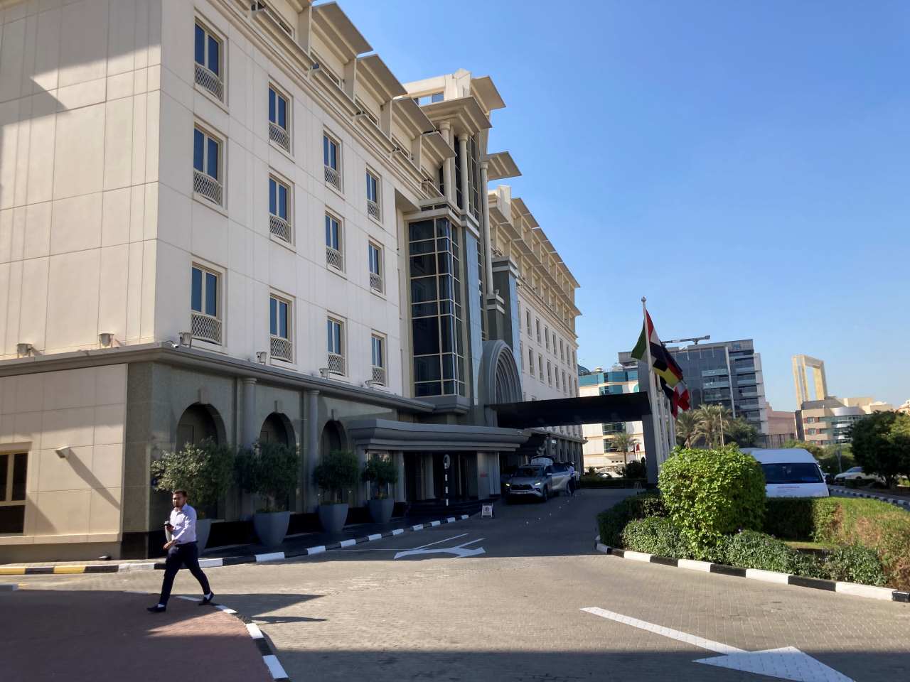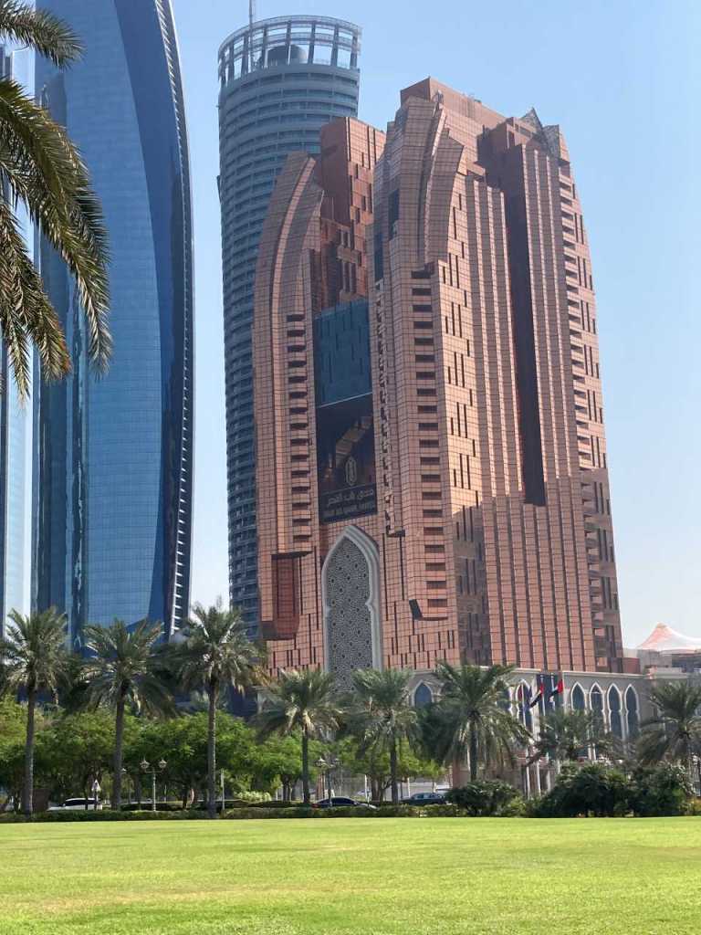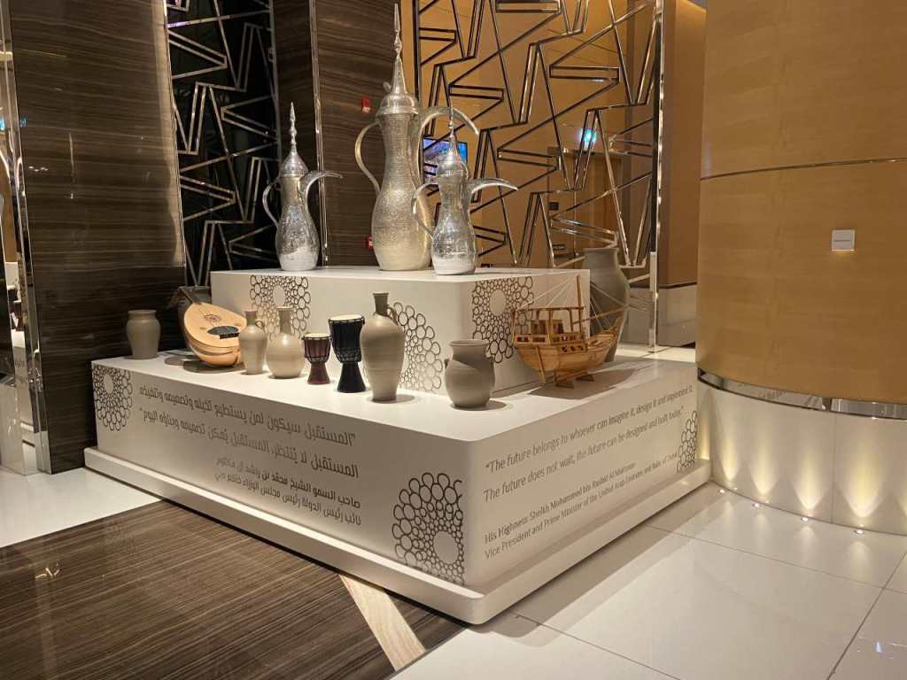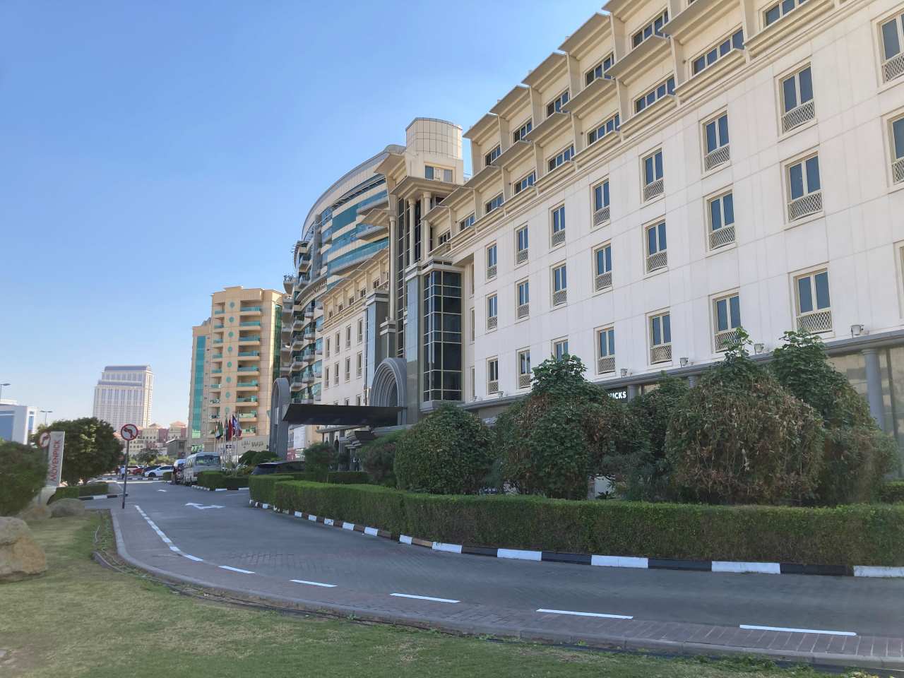 Gegen 11:30 verlassen wir unser hübsches Zimmer in der 11. Etage (in diesem Jahr können wir sogar The Frame und den Burj Khalifa durch unser Zimmerfenster sehen) und fahren ins Erdgeschoß hinunter zur Rezeption bzw. dem Ausgang. Wir haben noch bestimmt eine halbe Stunde Zeit bis unsere Kinder kommen. Ca. zwei hundert Meter zur linken Seite befindet sich das Hotel Mövenpick***** in diesem hübschen Hotel waren wir im Januar 2020, also kurz vor dem Corona-Ausbruch zu Gast. So gehen wir die paar Schritte um dieses Haus nochmals anzuschauen, ich hätte auch dieses Mal gern in diesem Hotel übernachtet, aber meine Tochter steht nicht auf diesen Baustil.