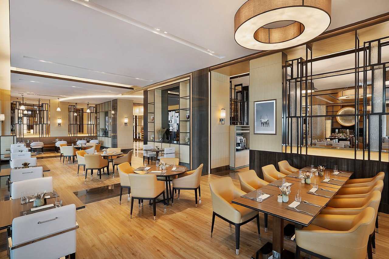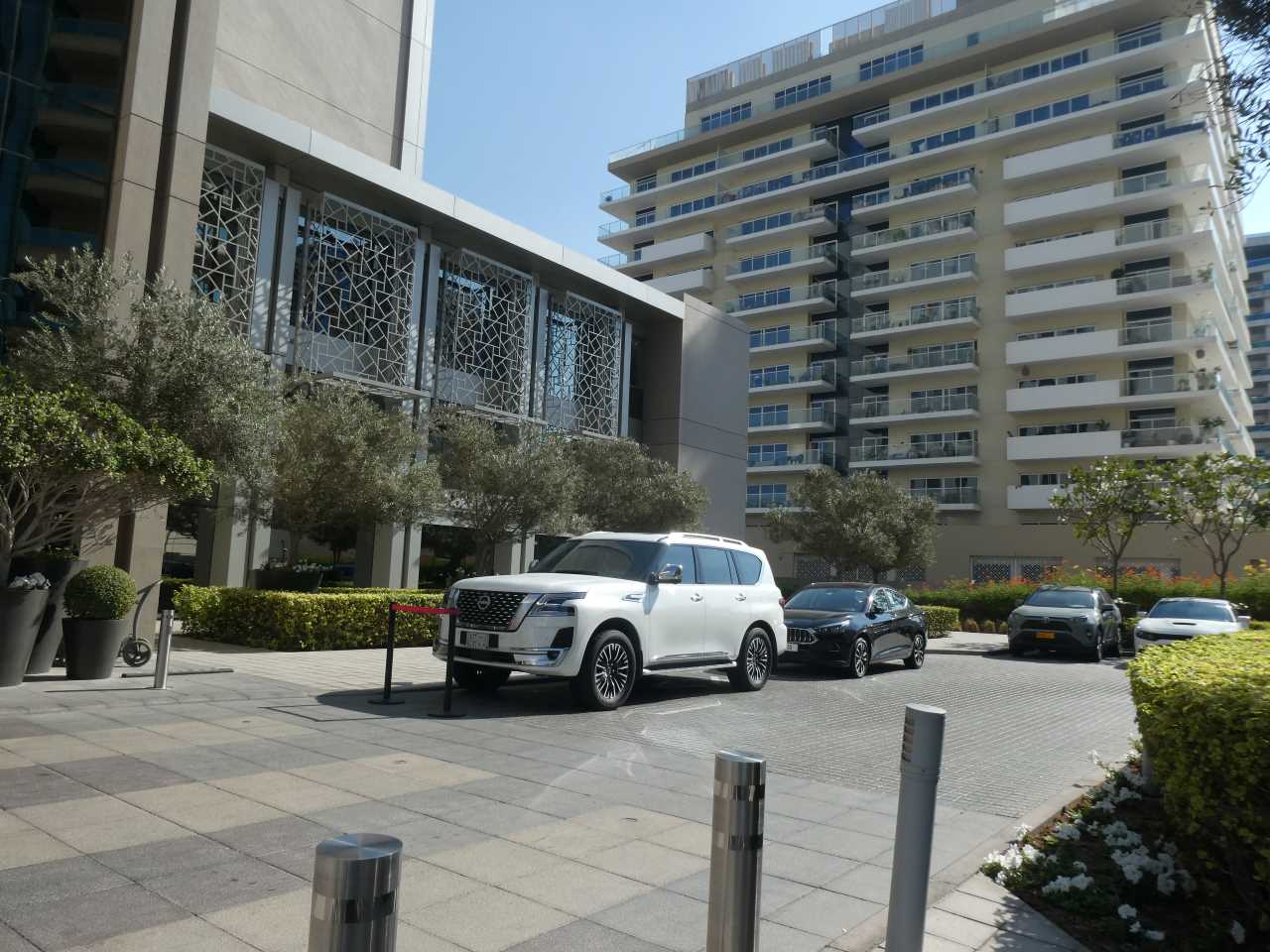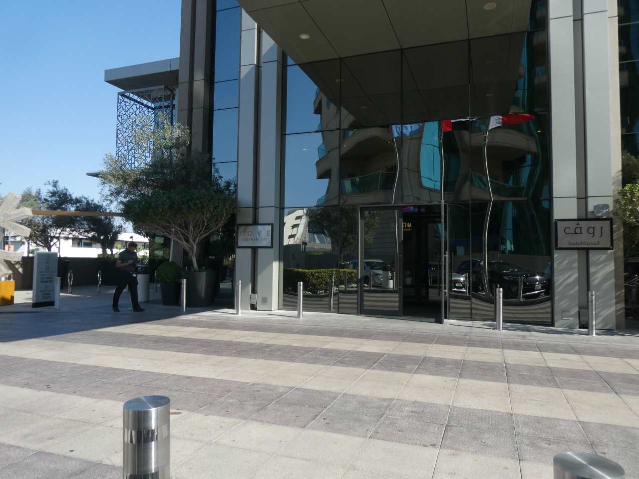 Gegen 11:30 verlassen wir unser hübsches Zimmer in der 11. Etage (in diesem Jahr können wir sogar The Frame und den Burj Khalifa durch unser Zimmerfenster sehen) und fahren ins Erdgeschoß hinunter zur Rezeption bzw. dem Ausgang. Wir haben noch bestimmt eine halbe Stunde Zeit bis unsere Kinder kommen. Ca. zwei hundert Meter zur linken Seite befindet sich das Hotel Mövenpick***** in diesem hübschen Hotel waren wir im Januar 2020, also kurz vor dem Corona-Ausbruch zu Gast. So gehen wir die paar Schritte um dieses Haus nochmals anzuschauen, ich hätte auch dieses Mal gern in diesem Hotel übernachtet, aber meine Tochter steht nicht auf diesen Baustil.