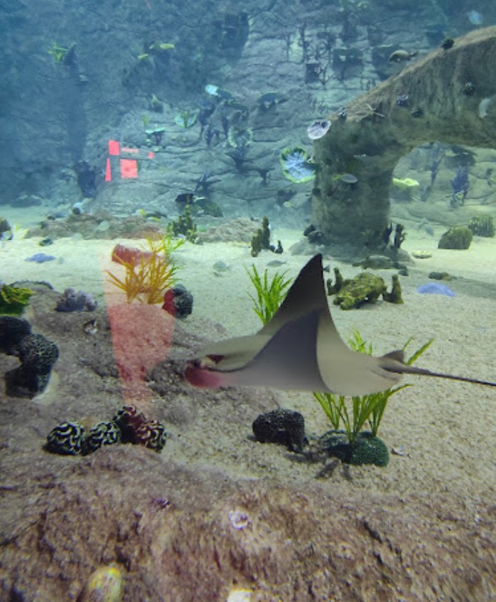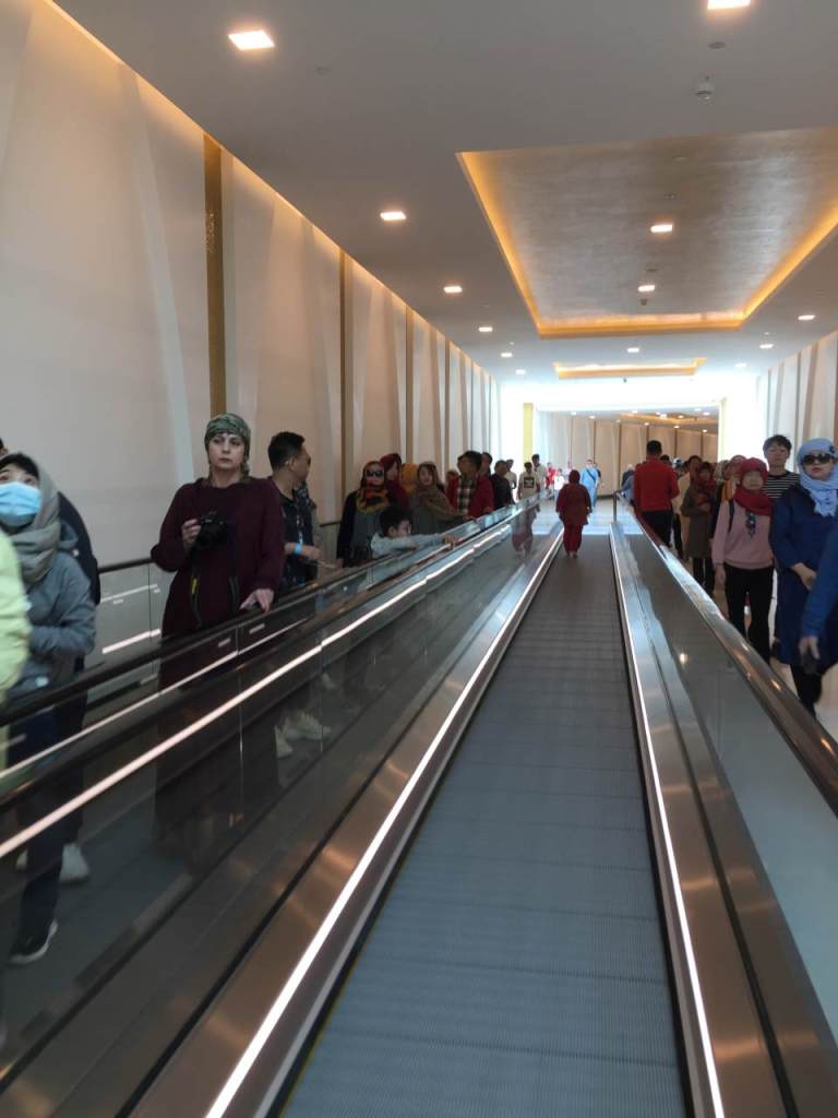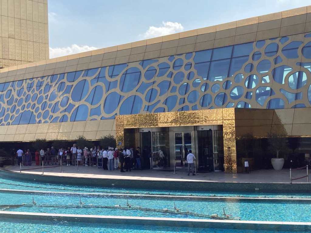 Wir betreten über eine Treppe das Grand Cruise Terminal von Doha, nach den üblichen Absperrungen sehen wir vor uns ein riesiges Aquarium das sich mindestens über 2 Stockwerke erstreckt. Unser Enkel ist kaum von den schönen Fischen abzubringen. Danach geht es über eine Rolltreppe nach unten, wo die Sicherheitskontrolle auf uns wartet. Kurz vor dem Ausgang können wir noch Geld umwechseln in Katar Riyal, das wir für unsere Taxis wohl brauchen werden.