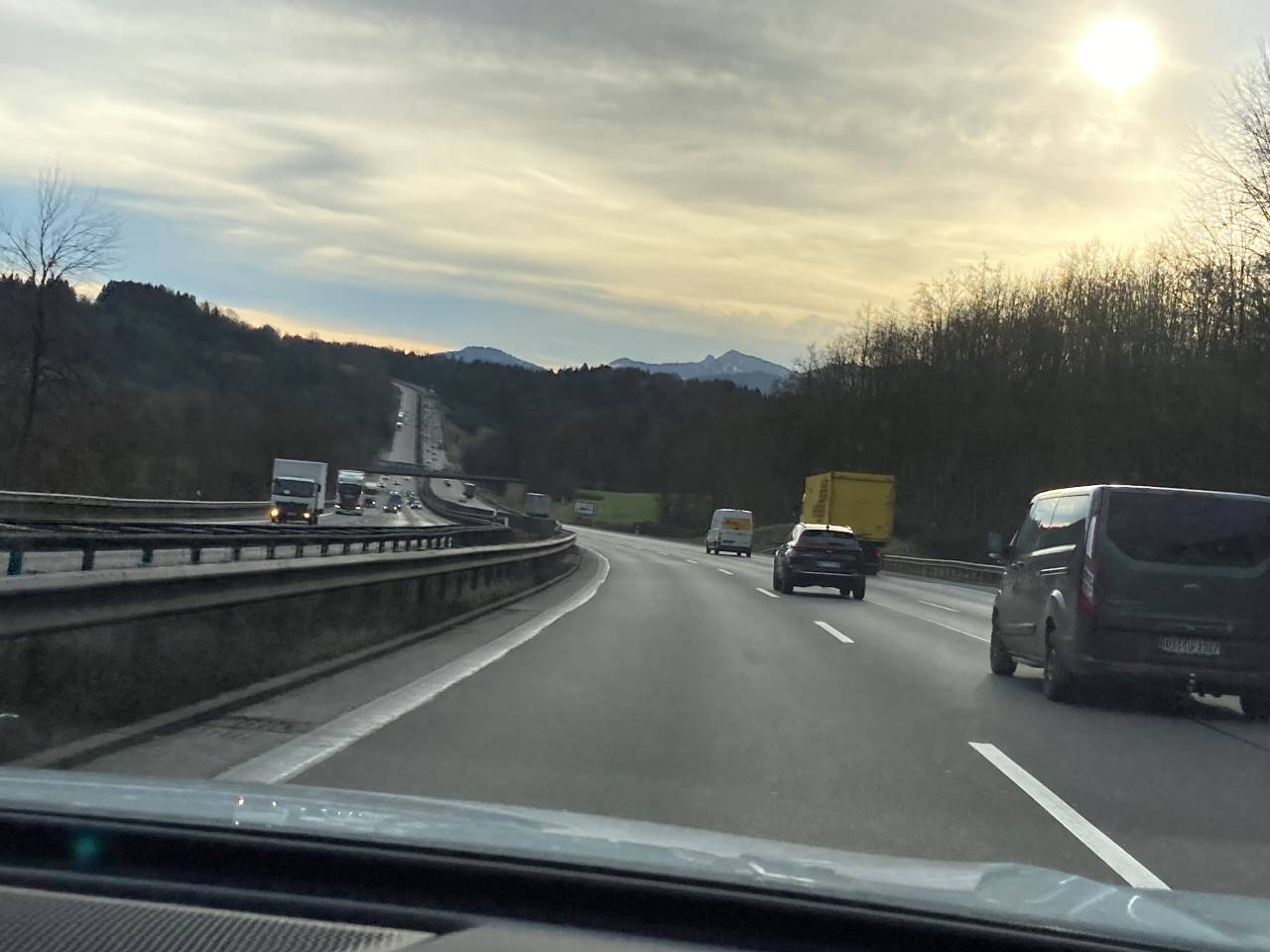 Jetzt können wir endlich das Parkhaus verlassen, und nach wenigen Minuten haben wir die Deutsche Staatsgrenze erreicht. Wir befürchteten schon eine Personenkontrolle an der Grenze zu bekommen, aber es ging alles reibungslos. Unsere Fahrt war bis München ruhig und Angenehm, bis auf einige Staus wo wir im Schritt-Tempo fahren mussten. Auf einem Rastplatz kauften wir noch Kaffee To Go, mein Schwiegersohn kaufte noch ein paar Butterbrezeln dazu. Alles zu überhöhten Rastplatzpreisen. In München angekommen tritt plötzlich Starker Wind auf, Blätter wirbeln durch die Luft. Wenig später fängt es zu Regnen an, der uns noch die restliche Fahrt bis nach Ottobeuren begleitet hat.