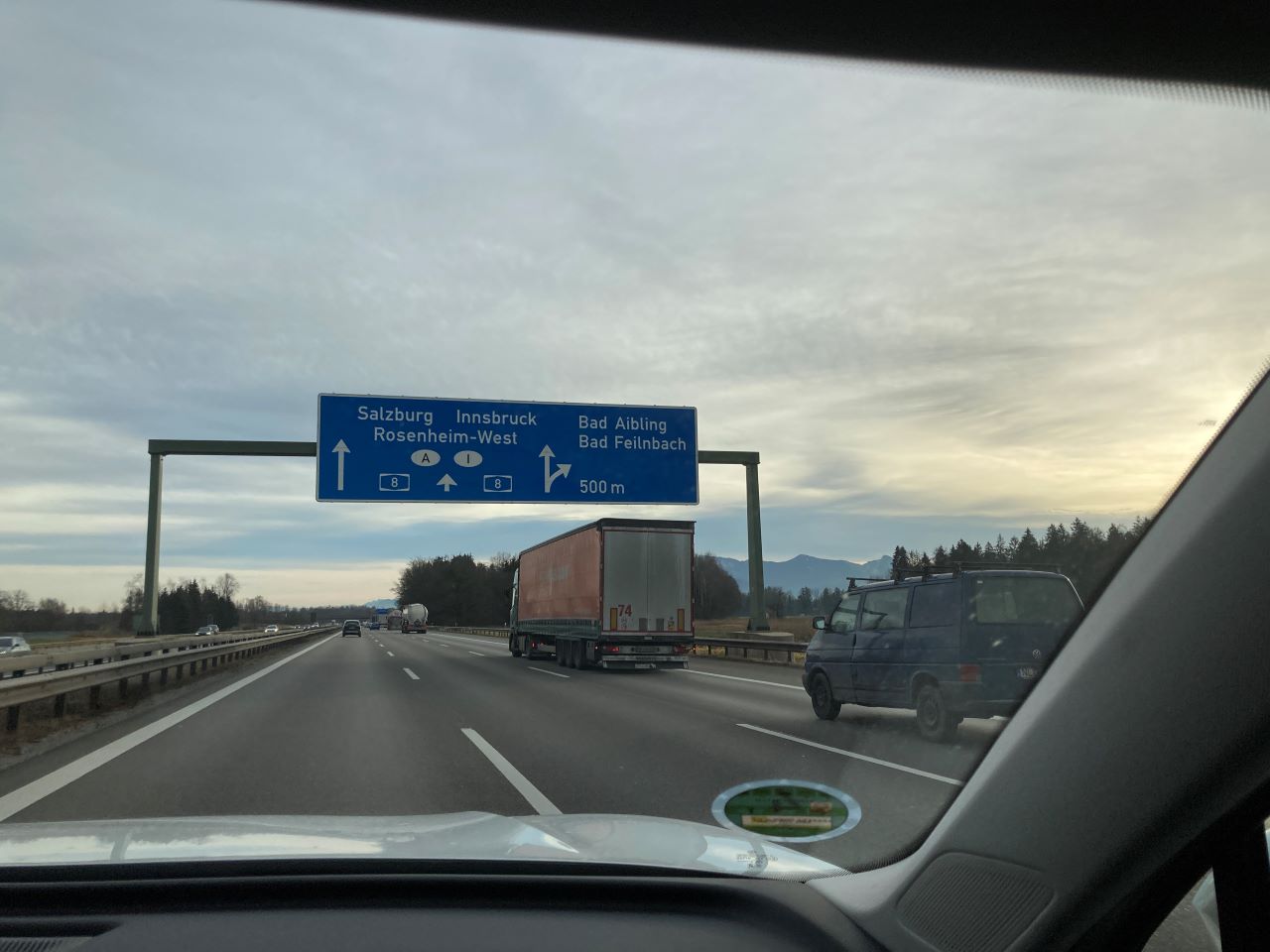 Kurz darauf kann es losgehen, mein Schwiegersohn sitzt am Steuer, weil die Befürchtung vorherrscht, bei meiner Fahrgeschwindigkeit die Fahrt etwas länger dauern könnte. In Sontheim/Allgäu fährt er auf einer Nebenstrecke nach Stetten, wo wir die Autobahn A96 nach München erreichen. Der Straßenverkehr in die Landeshauptstadt einschließlich dem Gegenverkehr hält sich in angenehmen Grenzen. Der Stadtverkehr am mittlerem Ring in München ist da schon etwas heftiger. Trotz allem es geht voran, und bald darauf haben wir das Kreuz München Süd erreicht, wo es auf der A8 weitergeht in Richtung Inntal Dreieck.