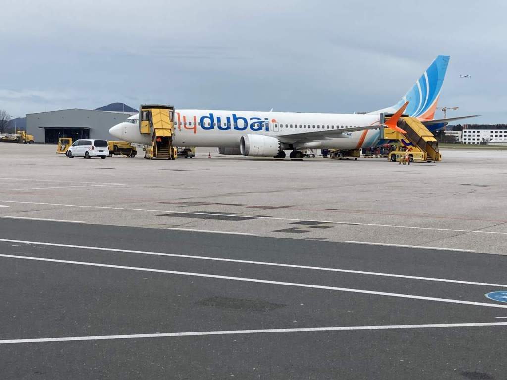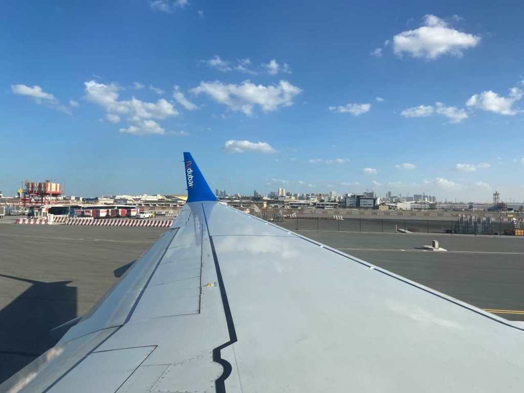 Mittlerweile ist es kurz nach 13:00 geworden, als wir den Sicherheitsbereich betreten, kein Vergleich mit den großen Flughäfen wie München, Frankfurt oder andere. Es gibt auch hier nette Shops, es wirkt einladender als im Eingangsbereich. Hinter den großen Fenstern sehen wir unsere Maschine von Fly-Dubai die uns in die Emirate bringen soll. Wenig später um 13:15 ist Boarding angesagt, und wir können zu Fuß über die Landebahn zu unserem Flugzeug gehen. Wie ich später feststelle ist es eine Boeing 737 max (hier gab in den vergangenen Jahren große Probleme, weil einige der Maschinen abgestürzt sind)