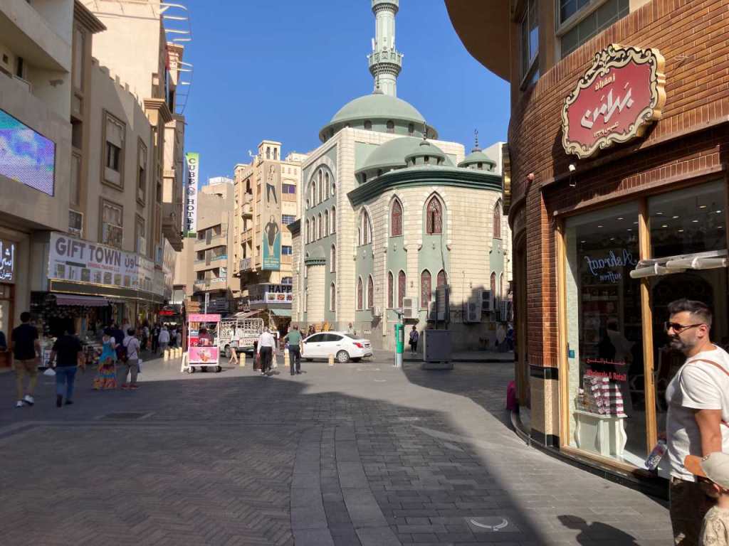 Wir waren schon mehrmals in dieser Straße, es ist immer wieder nett und Interessant die vielen Schmuckgeschäfte anzuschauen. Nachdem wir den Goldsouk am Ende der Straße wieder verlassen haben, wollten wir jetzt wieder zurück in Richtung Creek gehen. Meine Jugend möchte aber nicht den gleichen Weg zurück bis zum Gewürzsouk gehen, offensichtlich haben sie genug gesehen, schade eigentlich. Wir gehen jetzt auf einer Nebenstraße in Richtung Fluss. Plötzlich ertönt der Ruf des Muezzins der die Gläubigen zum Gebet aufruft. Auf unserem Weg sehen wir eine große Anzahl von Männern auf der Straße knien und beten. Nachdem wir den Creek erreicht haben, möchte ich gern eine kleine Cafeteria am Ufer aufsuchen.