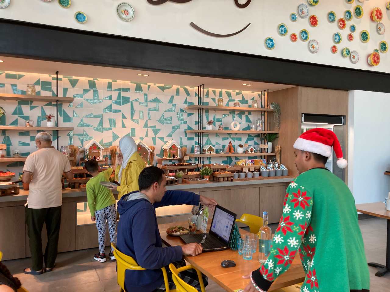 Guten Morgen, nach unserer späten Ankunft gestern Abend auf dem riesigen Flughafen DXB von Dubai sind wir heute Morgen etwas später aufgestanden. Es ist 7:30 als wir aufstehen und zum Frühstücken in den Speiseraum im Erdgeschoß gehen. Der Speisesaal macht einen netten Eindruck, als auch das Angebot am Frühstücksbuffet einen sehr guten Eindruck macht. Die Bediensteten laufen mit Weihnachtlichen Zipfelmützen umher. Zusätzlich kann man zum Buffett noch Eierspeisen oder Omelette bestellen. Es gibt 2 Kaffeeautomaten mit einem ausgezeichneten Kaffee. An jedem der Tische stehen noch Flaschen mit Trinkwasser zur Verfügung.