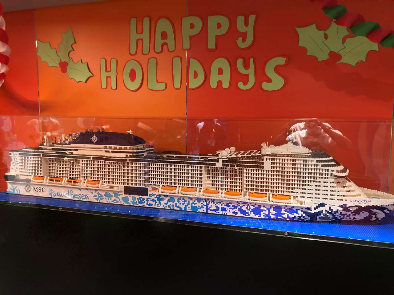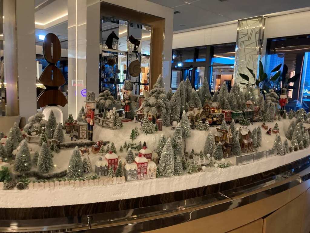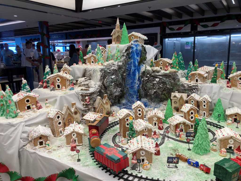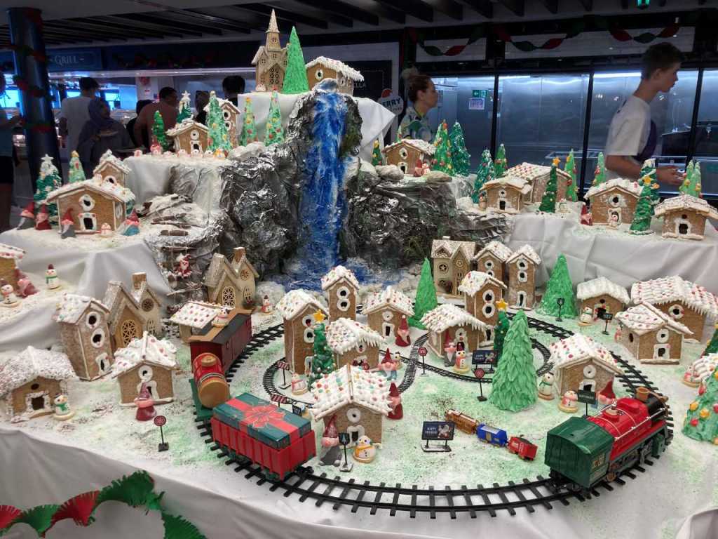 Wir gehen wieder zurück ins Schiffsinnere und streifen als erstes durch das Selbstbedienungs-Restaurant auf dem gleichen Deck. Am Eingang dieses Restaurants vor der Marketplace Bar ist eine hübsche Winterlandschaft aus Lebkuchen und einer Eisenbahn aufgebaut. Wir gehen danach auf Deck 16 hinauf an der Außenreeling entlang nach hinten ans Heck, wo sich die Horizon Bar, das Sun-Deck sowie ein weiterer kleinerer Pool und Badeliegen befinden. Wir nehmen wir an einem der zahlreichen Tische Platz um unser erstes Getränk auf der MSC Euribia zu bestellen. Mein Schwiegersohn und ich trinken ein Heinecken Bier und meine Frau und unsere Tochter einen Strawberry Daiquiri, unser Kleinster hat ein Hörnchen Eis in der Hand. Mittlerweile ist es 15:45 geworden.