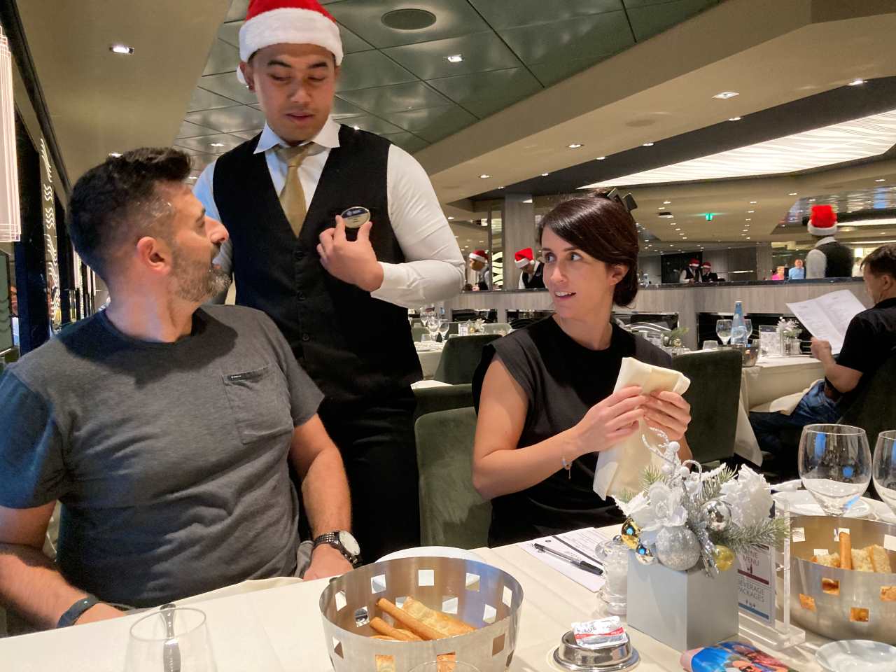 Es zeigt sich dass wir in der zweiten Esszeit keinen festen Tisch bekommen, sondern immer wieder warten müssen, wann und wo der Maitre uns einen Tisch gibt. (Das war wohl keine so gute Idee).