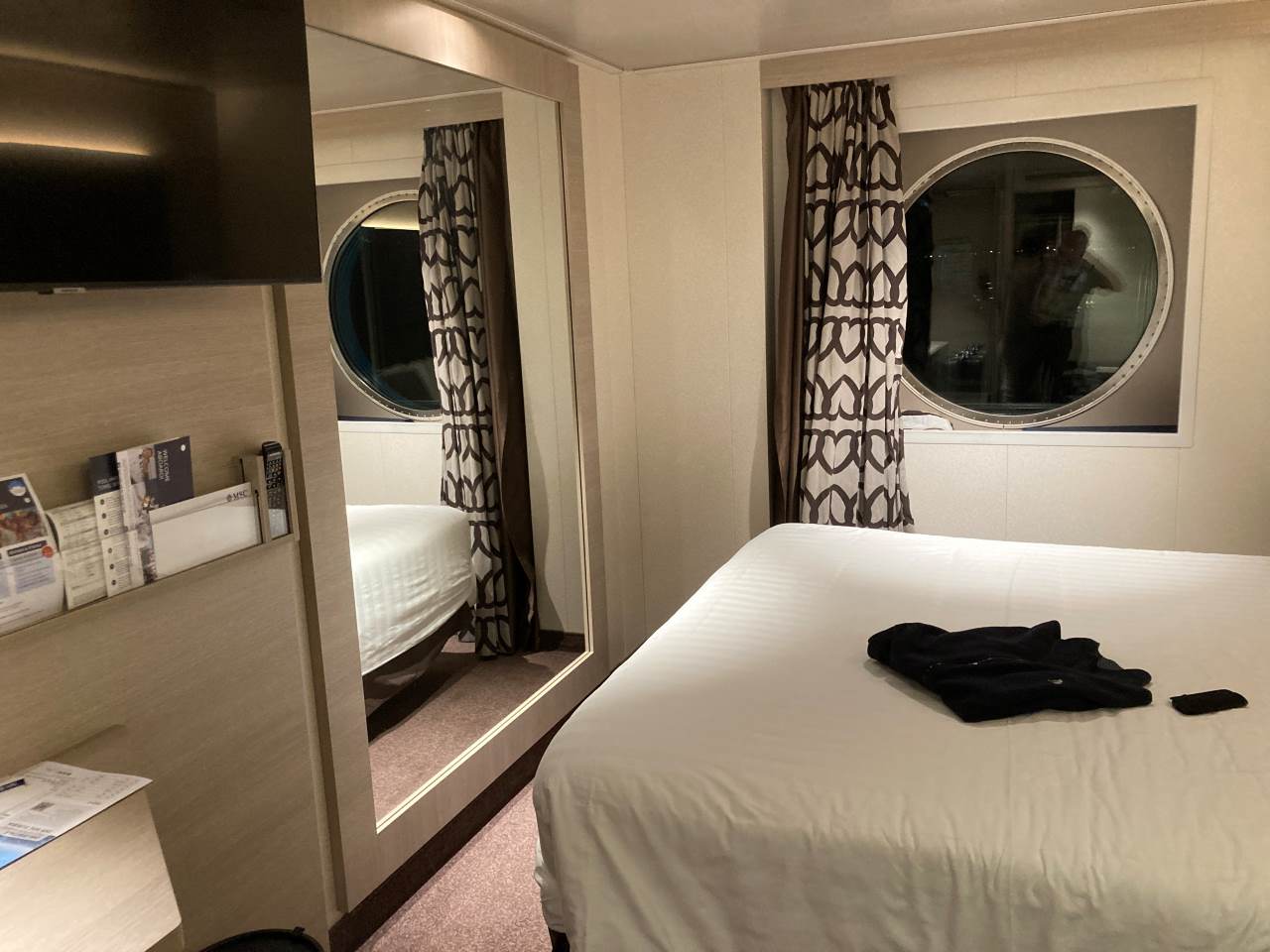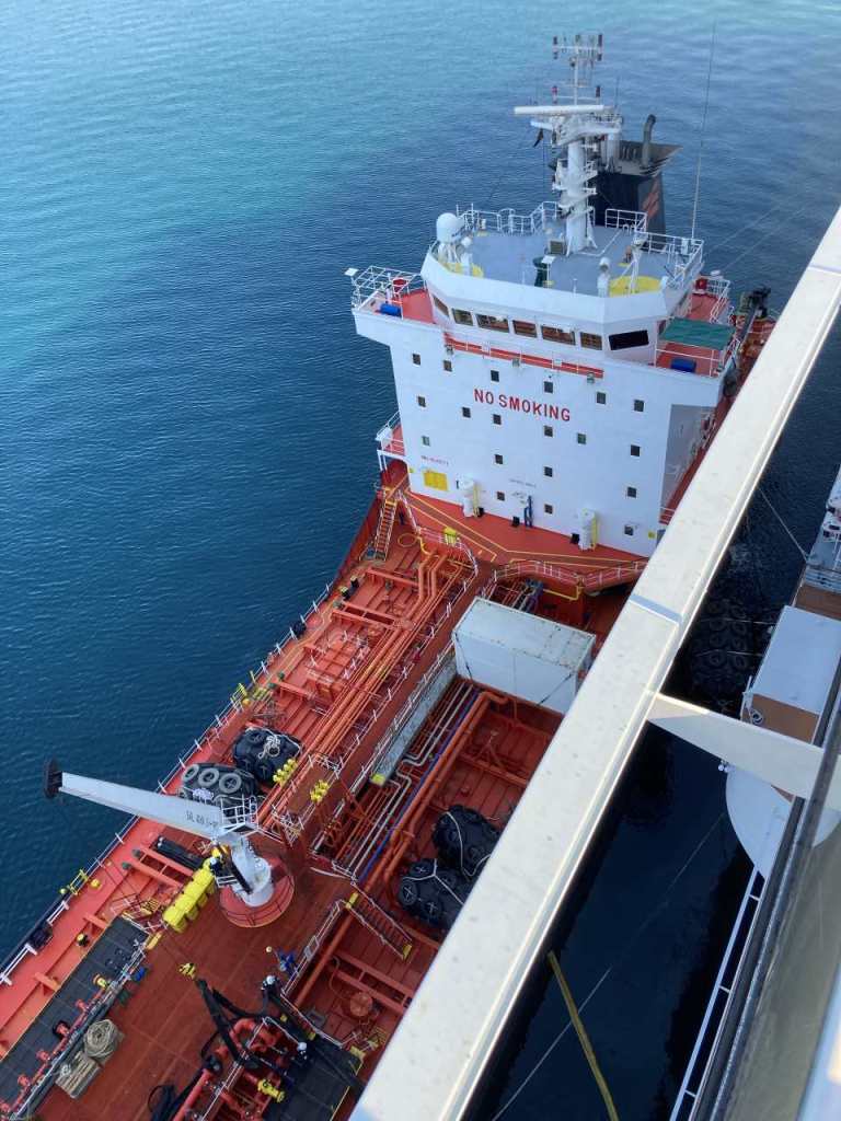 Als wir später einmal in unsere Kabine kommen, liegt eine Nachricht vom Schiff auf unserem Bett, mit Nachrichten bezüglich unserer morgigen Abreise. Wie wir durch unser Kabinenfenster sehen können ist das Tankschiff immer noch längsseits.