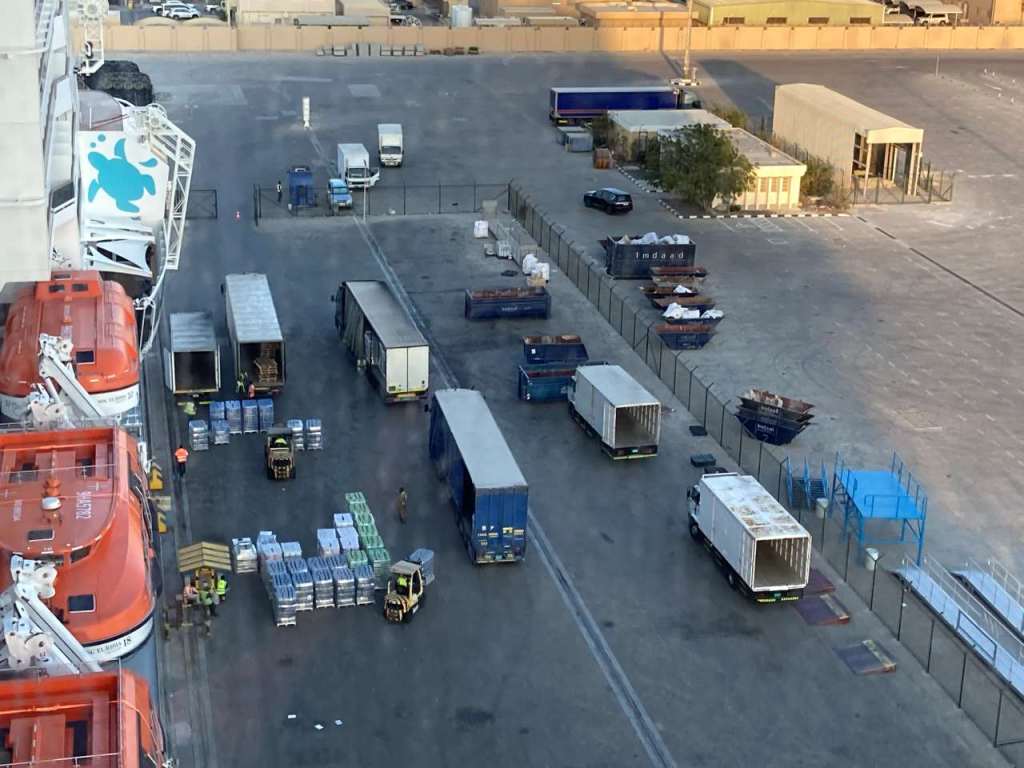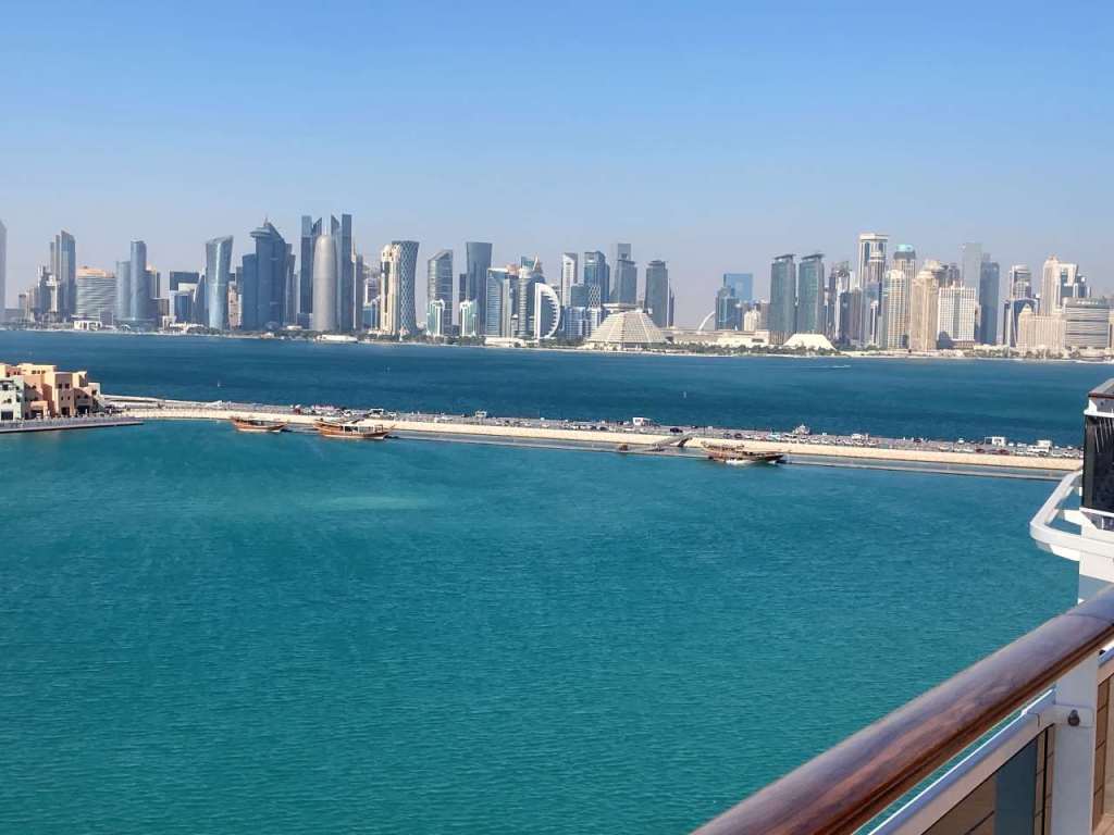 Guten Morgen, es ist schon 7:45 als wir aufstehen und uns zum Frühstücken fertig machen. Wir mussten noch gestern Abend die Uhr um eine Stunde zurück stellen. Die MSC Euribia steht in Doha/ Emirat Katar an der Reede. Wie wir schon gestern Abend bei einem kurzen Blick durchs Fenster feststellen konnten hat unser Kapitän einen sehr schnellen Speed hingelegt.