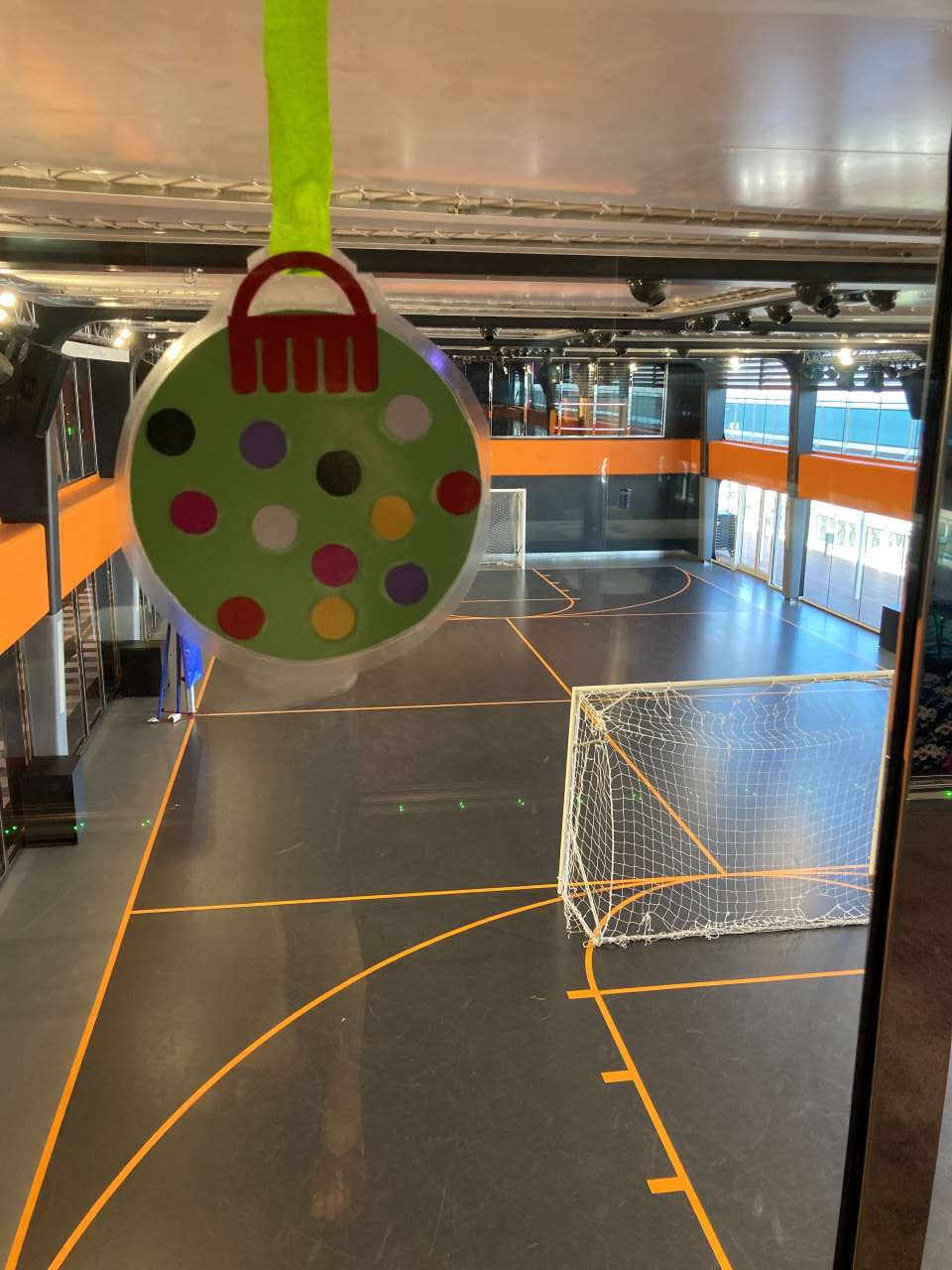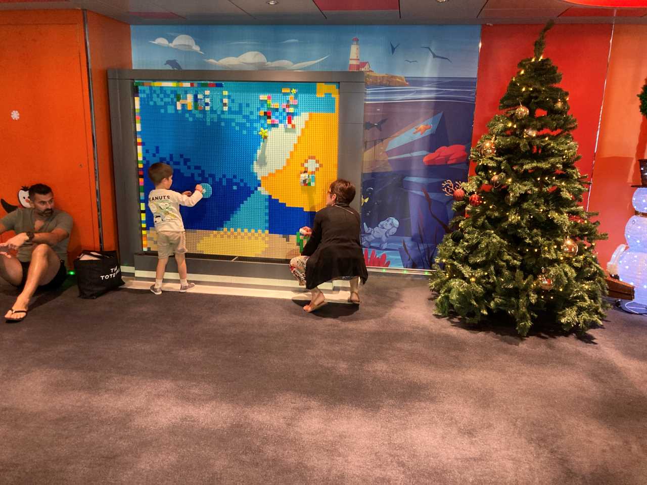 Nach langem Hin und Her müssen wir wieder gehen. Unterwegs kommen wir an einer Legowand vorbei, an dem unser Kleiner etwas spielen konnte. Gegenüber befand sich die riesige Sporthalle (Sportplex) die sich über zwei Decks erstreckte.