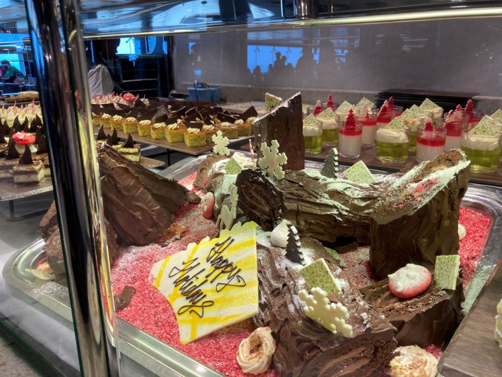 Wir fahren mit dem Fahrstuhl hinauf auf Deck 15 wo sich das Marketplace Buffet sowie das Marketplace Family & Kids befindet. Als wir im Buffett-Restaurant ankommen erschrecken wir, bei der Unmenge an Frühstücksgästen die hier sind. Man könnte glauben alle 6.400 Gäste des Schiffes essen hier. Im Marketplace Family & Kids finden wir noch einen freien Tisch für uns zwei. Zuerst besorgen wir uns 2 Gläser mit Obstsaft von einem der Getränkeautomaten. An den Tischen befinden sich eine Glocke, über die man beim Kellner Kaffee oder andere Sachen bestellen kann. Nach wenigen Minuten kommt ein Kellner vorbei und nimmt nach Einscannen unseres Bordausweises die Bestellung auf. Wenig später bringt ein anderer Kellner den bestellten Cappuccino vorbei. Danach gehen wir auf die Suche über die verschiedenen Stationen die das Selbstbedienungs-Restaurant bietet. Ich erspare mir darüber detailliert zu berichten, ich hole mir etwas Brot, Käse, Rührei oder Spiegelei, gegebenenfalls auch ein Omelett. Zum Süßen Teil des Frühstück gehört auch Marmelade oder etwaige Hörnchen und sonstiges Gebäck. Mein Frühstück hält sich auch hier in Grenzen. Ich denke aber gern an die Kreuzfahrten mit der mein Schiff 1 oder mein Schiff 6 wo es ein tolles Frühstück im Hauptrestaurant gab. Ungern dagegen an mein Schiff Herz im Jahr 2022, hier war das Frühstücks-Buffett sehr spartanisch.
