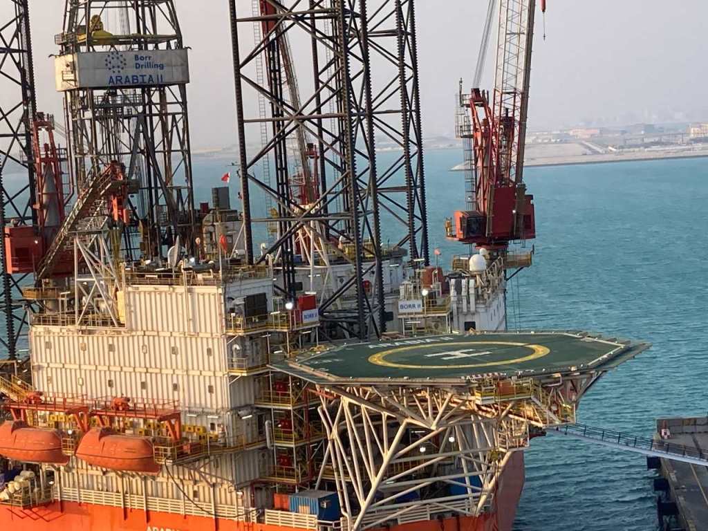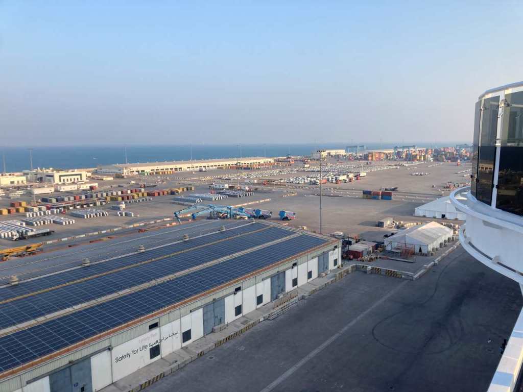 Als erstes mache ich ein paar Bilder von unserer Anlegestelle am Khalifa Bin Salman Port. Längs der Anlegestelle befinden sich viele Containerstellplätze. Mein Weg geht über Deck 16 als nächstes zum Indoor-Pool der sich etwas weiter vorne befindet. Von der Galerie im Indoor-Pool mache ich ein paar Fotos von dem durchaus beeindruckenden Hallenbad. Danach verlasse ich den Indoor-Pool um über das ganze Deck nach Hinten zu gehen. Am Heck beim Horizon Amphitheater mache ich noch ein Foto. Hinter unserem Schiff parkt die Bohrinsel Arabia II die zuvor in Saudi-Arabien eingesetzt war, und nun für 12 Monate ihren Betrieb aussetzen muss.