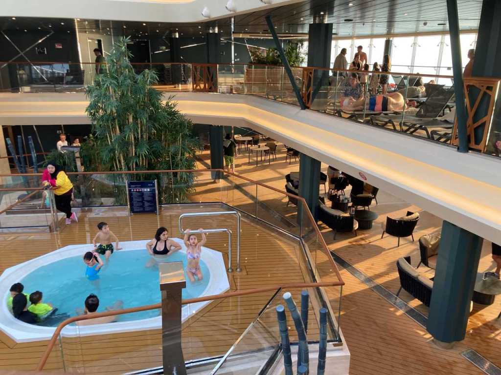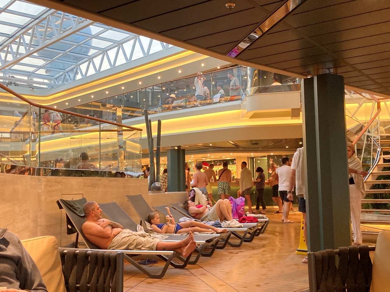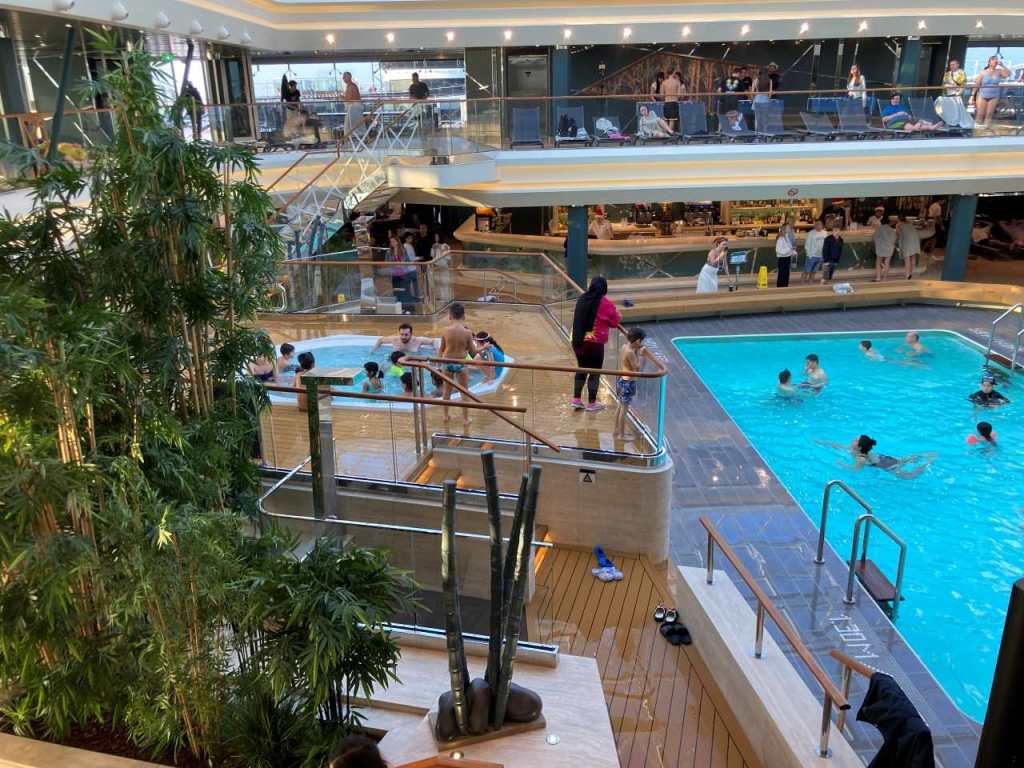 Ich versuche danach noch auf Deck 19 zu kommen, wo sich der Kletterpark befindet, finde aber keinen Zugang zum Park. Ich gehe über Deck 18 an der großen Sporthalle, wo gerade ein Spiel stattfindet, und dem Kidsclub vorbei zum Pooldeck. Wenig später wechseln wir zum Indoor-Pool. Unser Schwiegersohn ist seit geraumer Zeit beim Sport machen im Gymnastic-Raum. Unser Enkel geht mit seiner Mama in den Innenpool, allerdings ist die Wassertemperatur hier sehr kühl. Zum Aufwärmen gehen sie im Anschluss in der Wirlpool, meine Frau und ich sitzen auf eine der zahlreichen Lounge-Sessel und genießen ein Getränk von der gleich daneben liegenden Tropical-Bar.