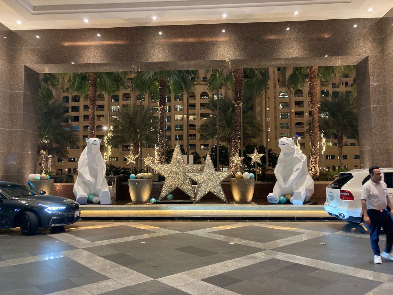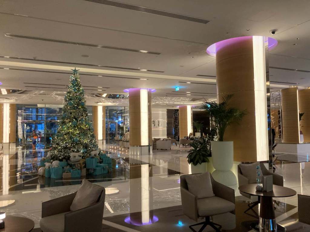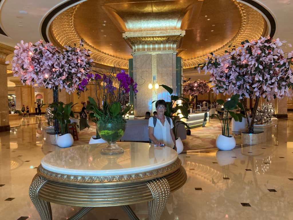 Irgendwann biegt er dann doch ab, und wir fahren auf der Sheik Khalifa Bin Zayed Road weiter. Wir kommen am Museum of The Future und den Jumeirah Emirates Tower vorbei. Etwas weiter entfernt fahren wir am Burj Khalifa vorbei, ich habe mir mal die Arbeit gemacht, und die Entfernungen geprüft. Bis zu unserem Hotel Marriot Resort Palm Jumeirah sind es vom Hafen mindestens 33 Kilometer. Um 12:30 sind wir an unserem Hotel angekommen, leider habe ich versäumt ein paar Bilder von der Überdachten Einfahrt bzw. dem Eingang zu machen. Wir betreten die riesige Hotelhalle, die meiner Schätzung nach bestimmt über 100 Meter lang ist. Während meine Tochter und mein Schwiegersohn die Einbuchung vornehmen, können meine Frau und ich die riesige Eingangshalle bewundern. Der Mitarbeiter an einem der vier Rezeptionstheken der meine Tochter bedient, ist nicht der schnellste, er wiederholt alle Modalitäten mehrmals. Aber irgendwann ist das auch fertig, und wir werden in unsere Zimmer 1012 und 1018 in der 10. Etage geführt. Wir sind alle beeindruckt von dem 5***** Hotel, es ist bestimmt eines der zwei besten Hotels, die wir in den letzten Jahren besucht haben.