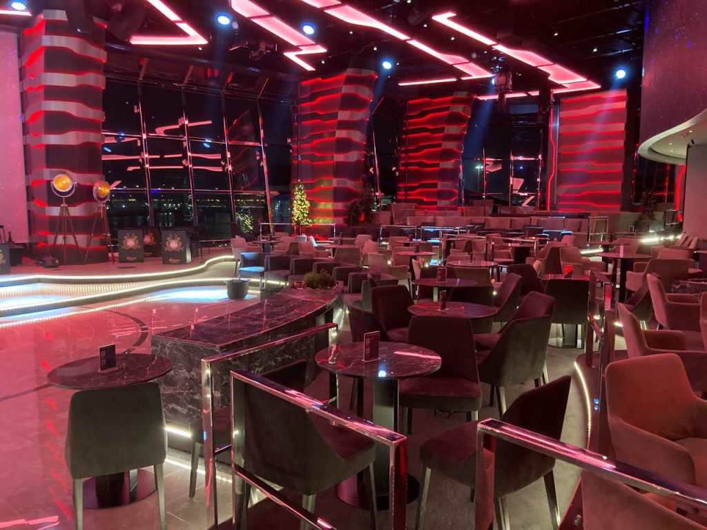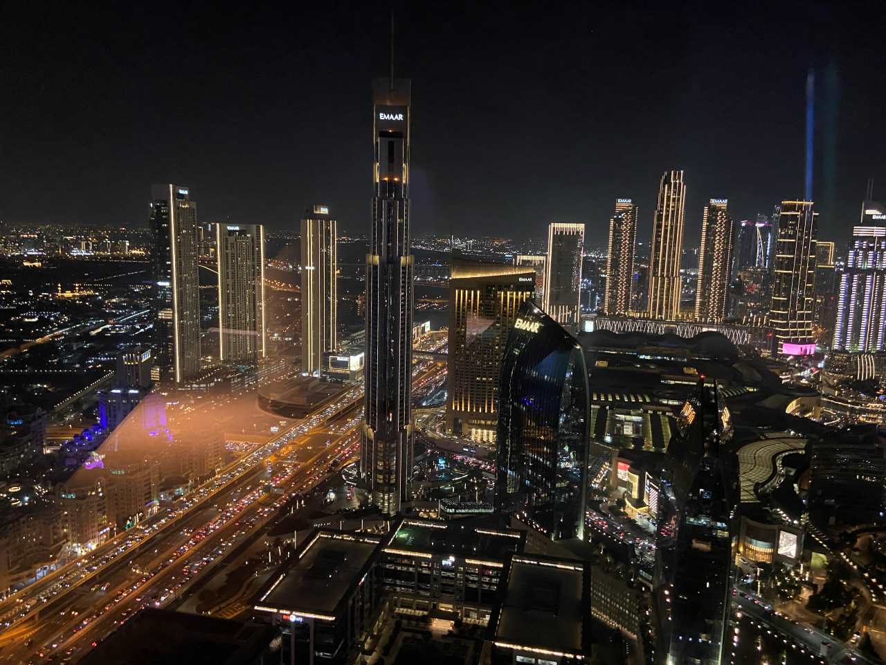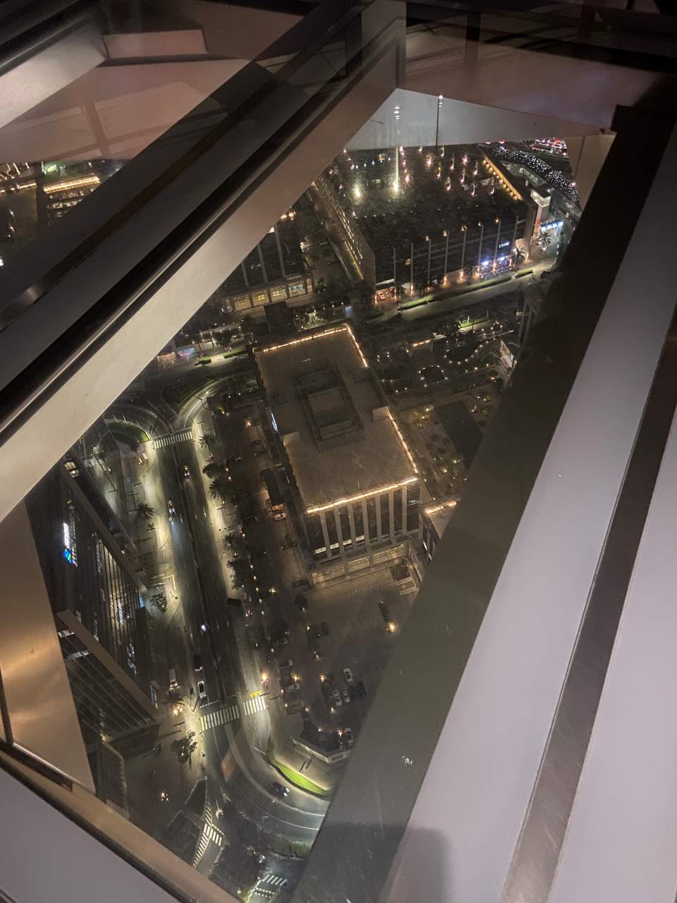 Ein gläserner Aufzug bringt uns nach oben, wobei drei Seiten einen beeindruckenden Panoramablick auf die Stadt bieten auf die 53. Etage zur Sky View Observatory. Von hier geht es über eine Wendeltreppe in die nächsttiefere Etage, von der aus eine 46 m lange Glasbrücke (Sky Bridge) zum Nachbargebäude führt. Von hier hat man einen schönen Ausblick auf das Nächtliche Dubai und sowie den Burj Khalifa.