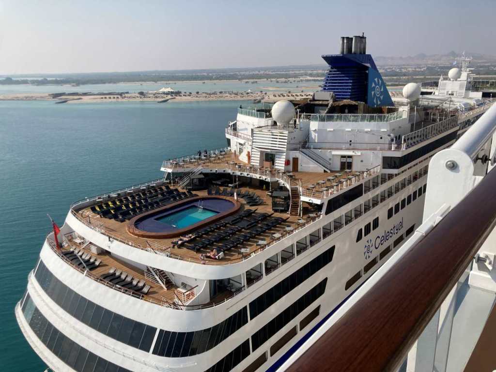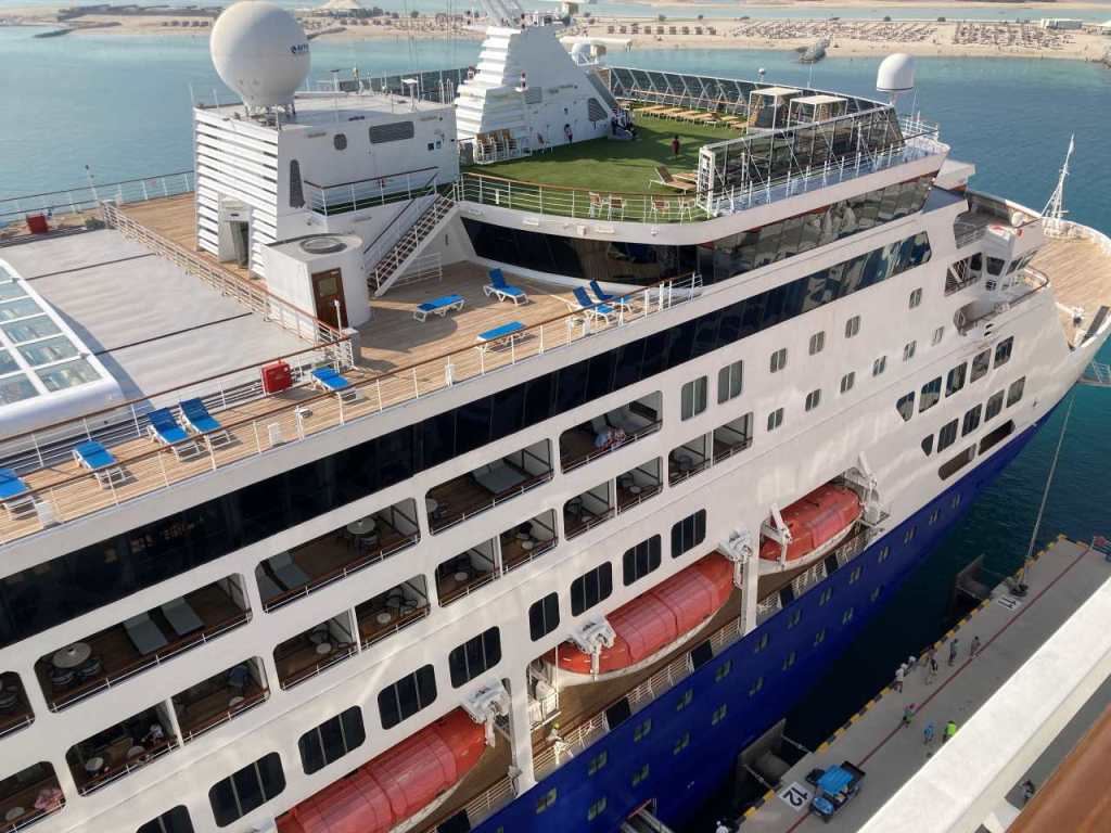 An der Reede unweit von uns am Kreuzfahrthafen Dubai Harbour liegt noch immer die Costa Smeralda, ich bin gespannt wann sie wieder auf Tour geht und abfährt. Kurz vor 10:00 kommt ein weiteres Kreuzfahrtschiff in den Hafen Dubai Harbour gefahren. Auf den ersten Blick kann man nicht erkennen, um was für ein Schiff es sich handelt. Erst mit dem Teleobjektiv meiner Foto-Kamera kann ich erkennen, es handelt sich um die Celestyal Journey die wir am Anleger von Sir Bani Yas Island gesehen haben.