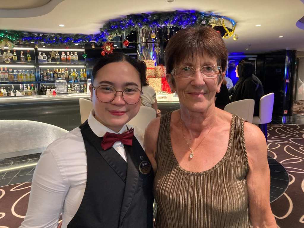 Nachdem sich unsere Jungen in die Kabine verabschiedet haben, gehen meine Frau und ich noch kurz in die Infinity-Bar zu einem kurzen Absacker. Wir haben hier eine sehr nette Bedienung von den Philippinen/Manila kennengelernt. Auch die anderen zwei weiblichen Bedienungen sind sehr freundlich und zuvorkommend. Eine kommt ebenfalls irgendwo aus Asien, die andere kommt aus Afrika. Nach einem Getränk an der Bar gehen wir ebenfalls in unsere Kabine zurück.