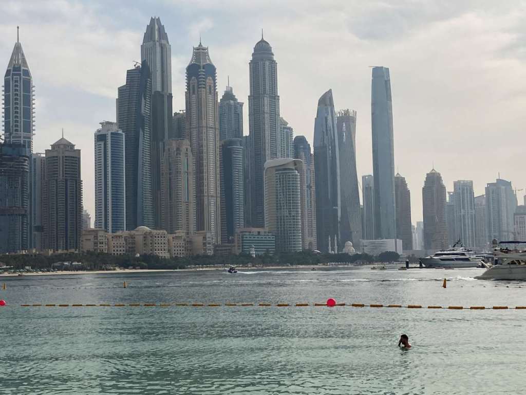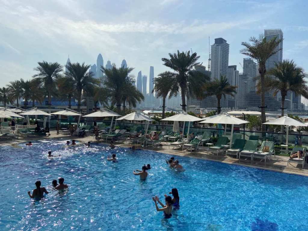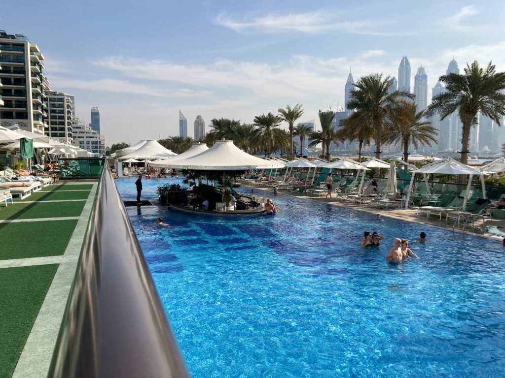 Nachdem wir drei gefrühstückt haben, gehen die Damen auf`s Zimmer zurück. Ich gehe hinunter zum Pool, um für die Familie ein paar Badeliegen zu suchen und Reservieren. Zu dieser frühen Zeit, es ist etwa 9:30 sind schon ca. 70% aller Liegen belegt. Beim Bademeister hole ich vier Badetücher, in der Etage oberhalb vom Pool finde ich noch vier freie Badeliegen, allerdings nicht beieinander. Fast eine Stunde später kommt meine Frau und nochmals später auch meine Tochter mit Familie vorbei. Kurz nach 10:00 sehen wir Rauch aufsteigen irgendwo in der Dubai Marina, genau können wir das von unserem Standpunkt nicht erkennen. Offensichtlich brennt es in der Nähe des Kreuzfahrthafens oder beim Riesenrad Ain Dubai.