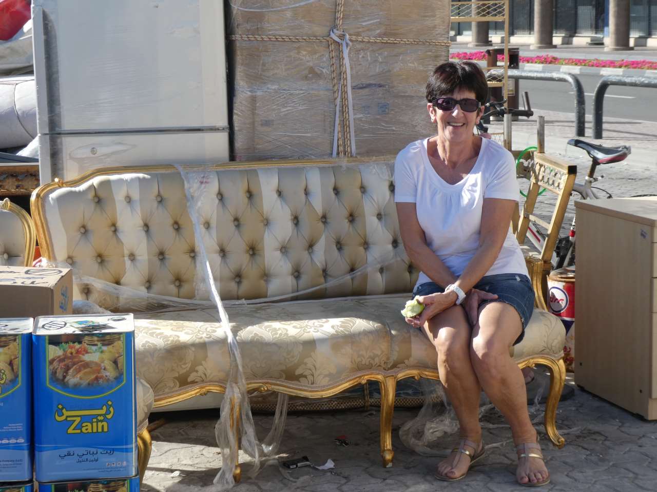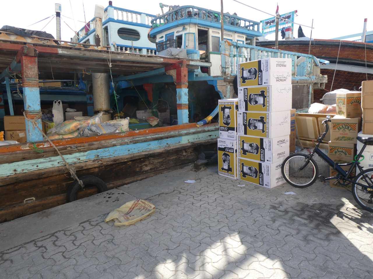 (Dhau / altes Segelschiff mit ihnen werden Küstennahe Frachtfahrten bis zum Iran, Pakistan oder Indien sowie Oman oder Afrika getätigt ). Wir sehen Flachfernseher, riesige Mengen an Klimageräten, Gefriertruhen und Kühlschränke sowie Staubsauger am Ufer stehen. Ebenso riesige Ballen an Stoffen liegen hier am Ufer, irgendwann werden sie abgeholt oder auf die Dhaus verladen.