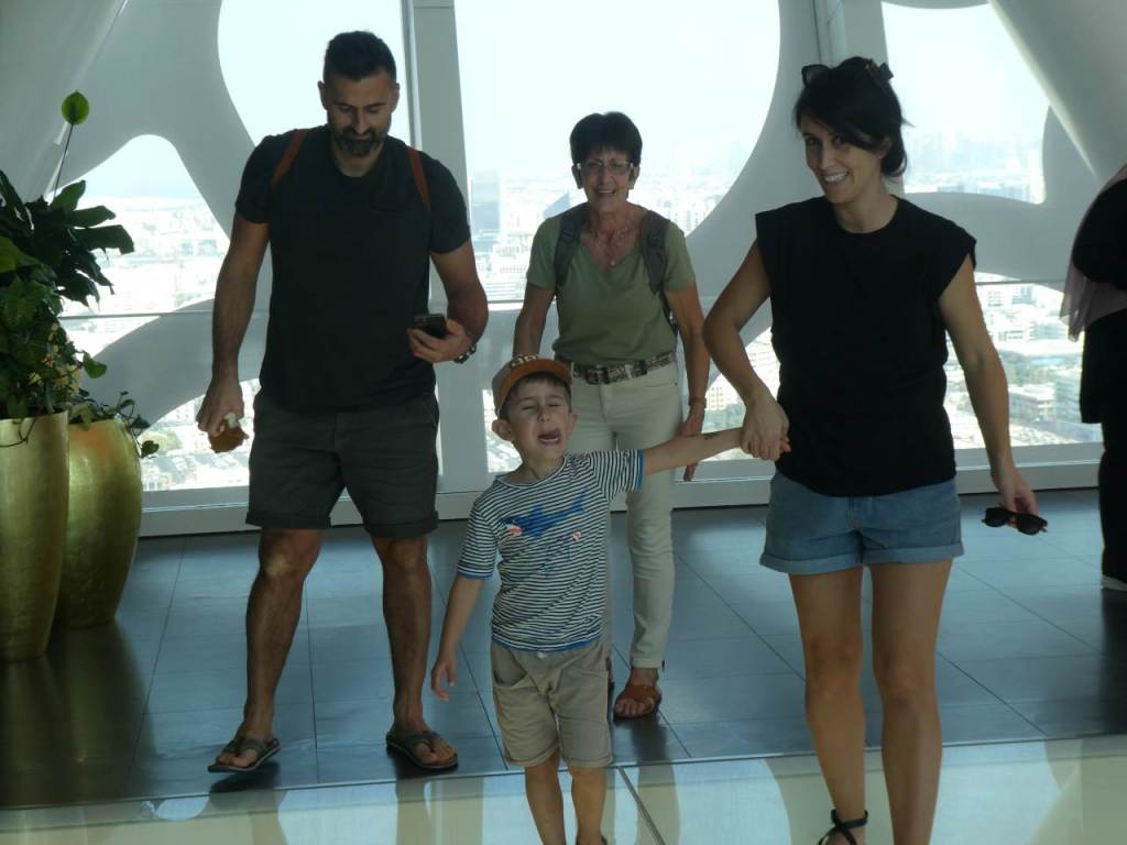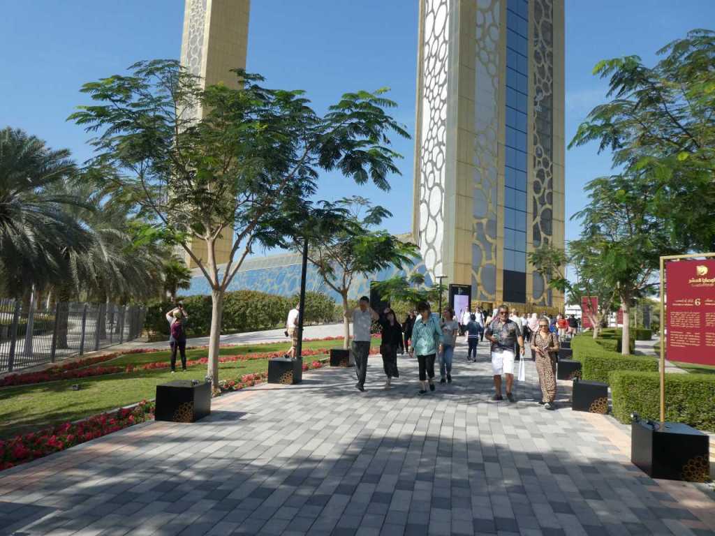 Für 11:30 haben wir ein Taxi bestellt das uns zum Zaabel-Park bringen wird, in dem der riesige Bilderahmen steht. Es sind nur ja wenige Kilometer bis zum „The Frame„. Wenige Meter vor dem Haupteingang lässt uns der Fahrer aussteigen. Wir haben bewusst auf einen Ticketkauf per Internet verzichtet, weil wir zeitlich ungebunden sein wollten. Wenige Meter vor dem Bilderrahmen haben sie eine Absperrung aufgestellt, um die Besucher zu dosieren. Hier stehen an die hundert Besucher und müssen warten. Wir haben aber Glück, beim dritten Öffnen der Sperre innerhalb einer Viertelstunde sind wir mit dabei. Im Inneren des „The Frame“ stehen wir nochmals kurz. Dann endlich können wir in den Fahrstuhl der uns die 150 Meter in die Höhe bringen wird. Der Fahrstuhl ist nach Außen mit Glas verkleidet, so dass man auch während der Fahrt Teile von Dubai in Richtung dem Hafen sehen kann. Hier Oben verbringen wir fast eine Stunde, und ich hoffe dass es allen gefallen hat. Unser Enkel, seine Mama und die Oma stehen sogar auf dem gläsernen Boden, unter Ihnen 150 Meter nichts.