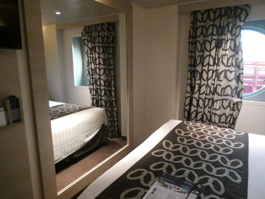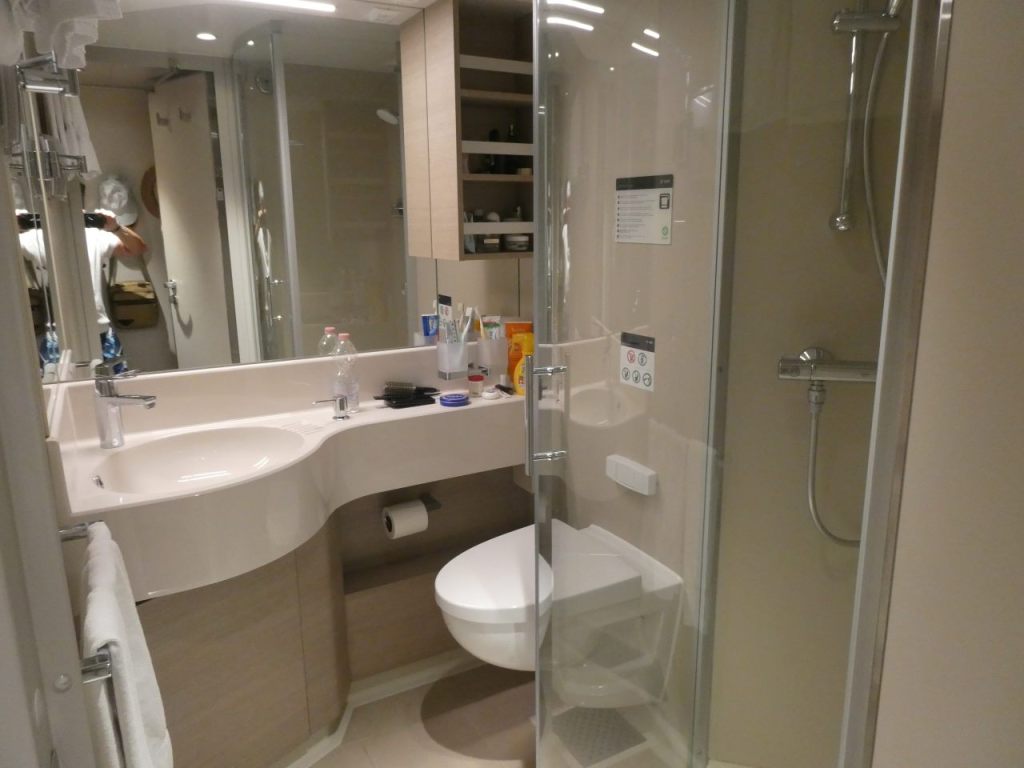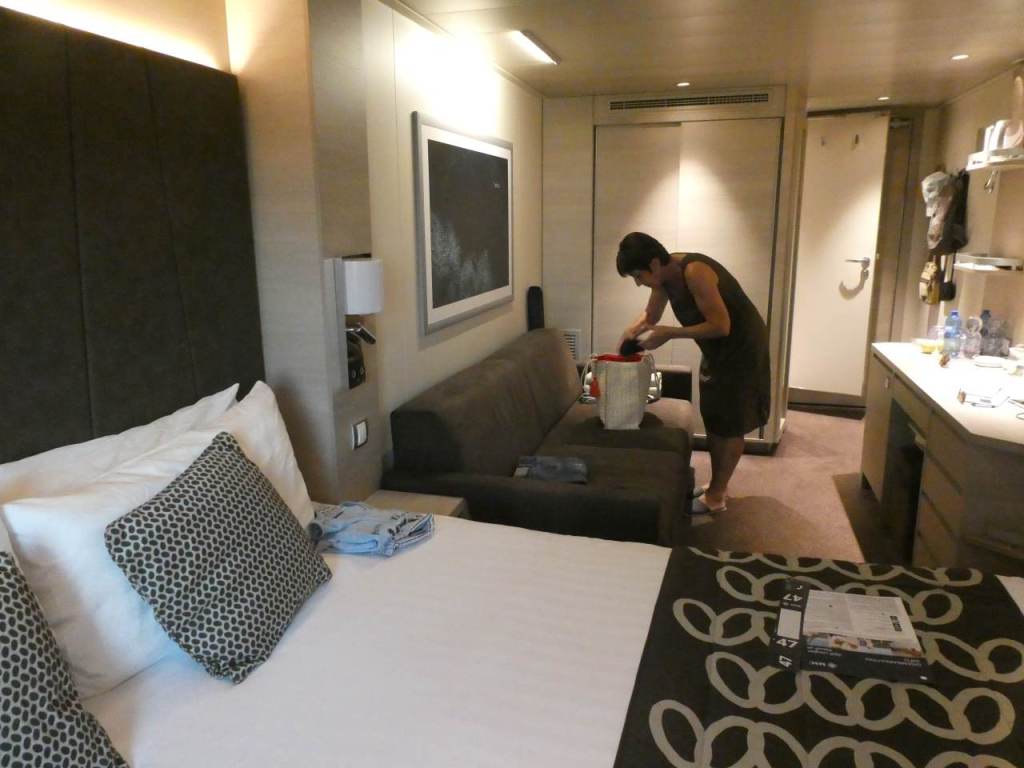 Mit unserem Handgepäck bestückt betreten wir auf Deck 4 das riesige Schiff. Über einen Treppenaufgang gehen wir weiter auf Deck 5 hinauf, wo sich die Rezeption und auch unsere Kabinen befinden. In unseren Formularen die wir beim Check-In bekommen hatten steht, gehen sie zuerst zu ihren Kabinen. Was uns nicht klar war, das der Bordausweis an der Kabinentür befestigt war. Nachdem wir unsere Kabine inspiziert haben, und als schön befunden haben, verlassen wir wieder die Kabine.