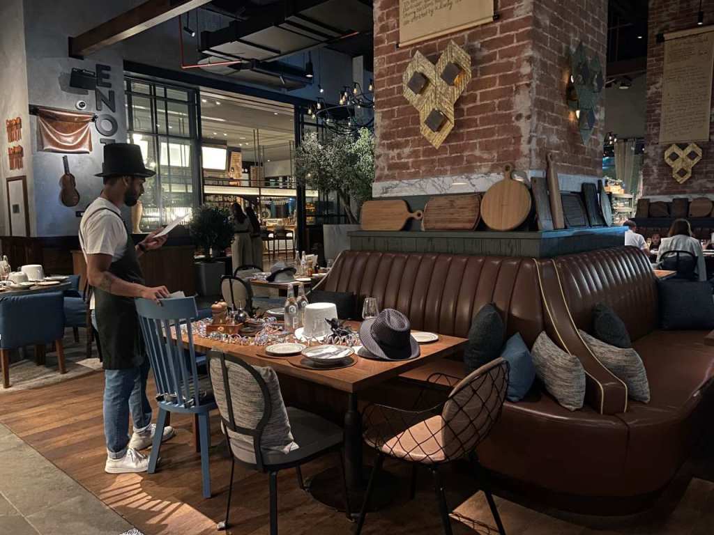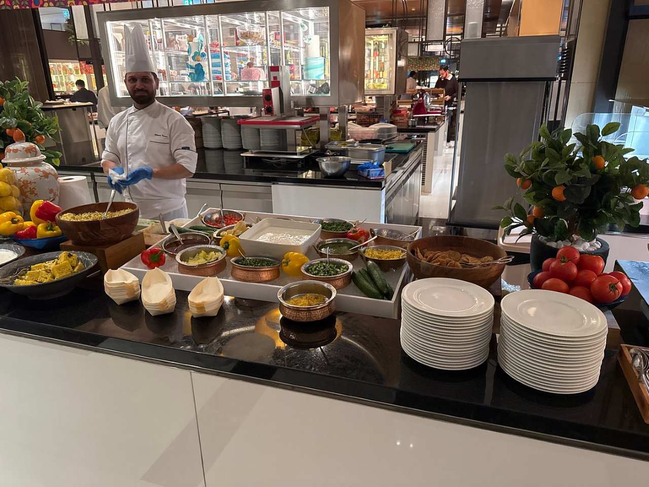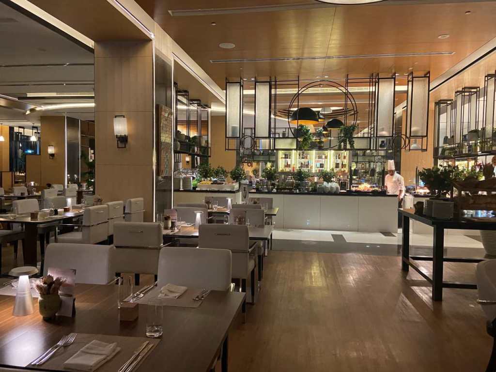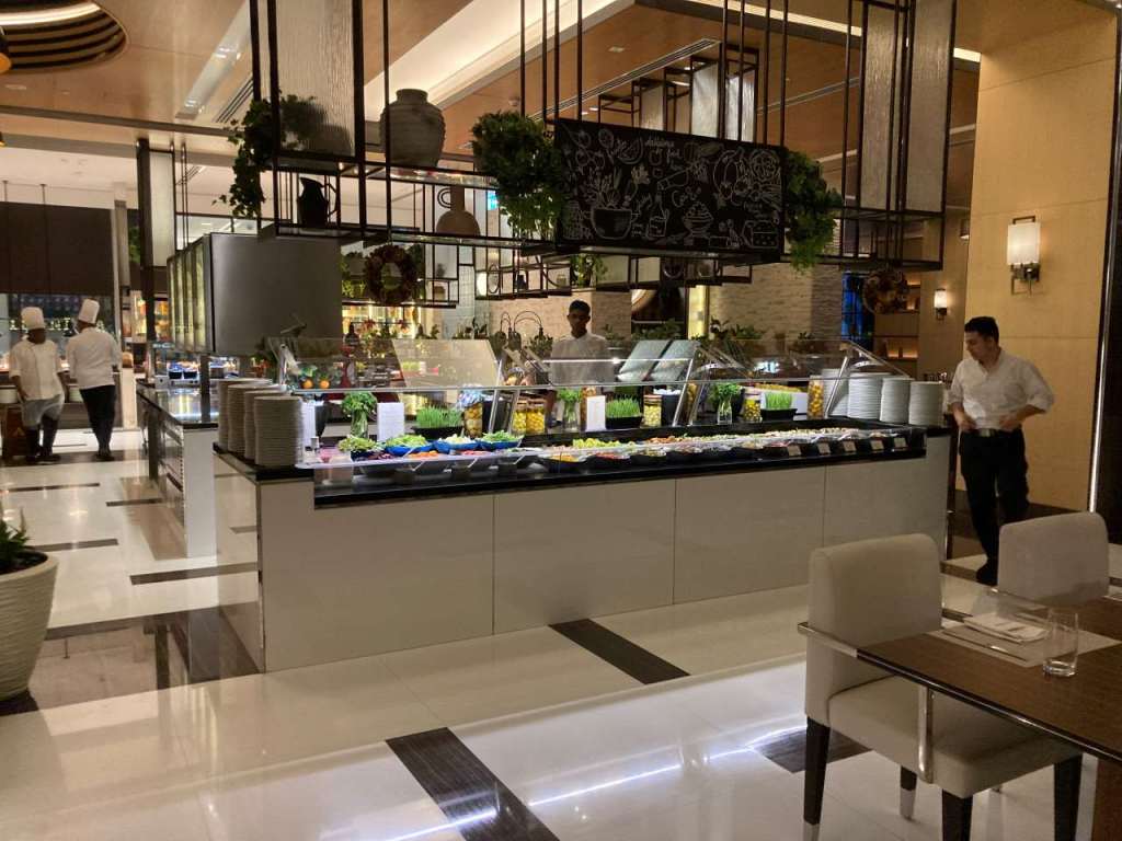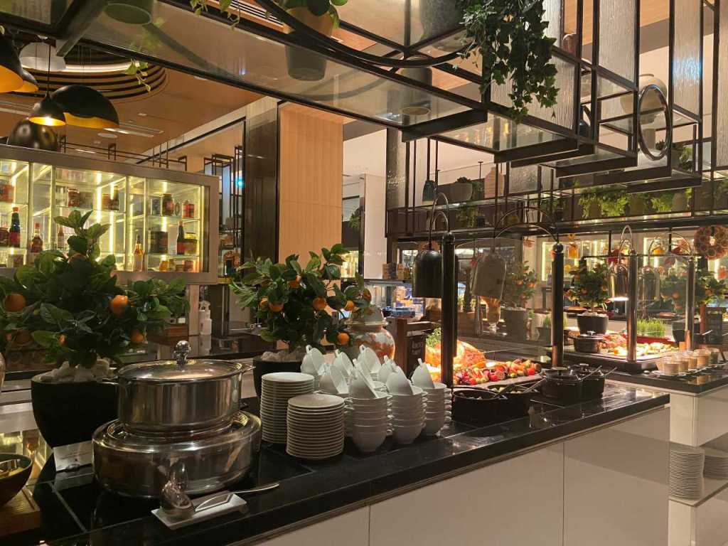Nachdem wir uns am Eingang des Restaurants angemeldet haben, begleitet uns eine der Bediensteten zu einem Tisch auf der Terrasse. Wir bestellen bei einem Kellner unsere Getränke, danach gehen wir an die reichhaltige Theke, um unsere Teller mit schmackhaftem Essen zu füllen.
