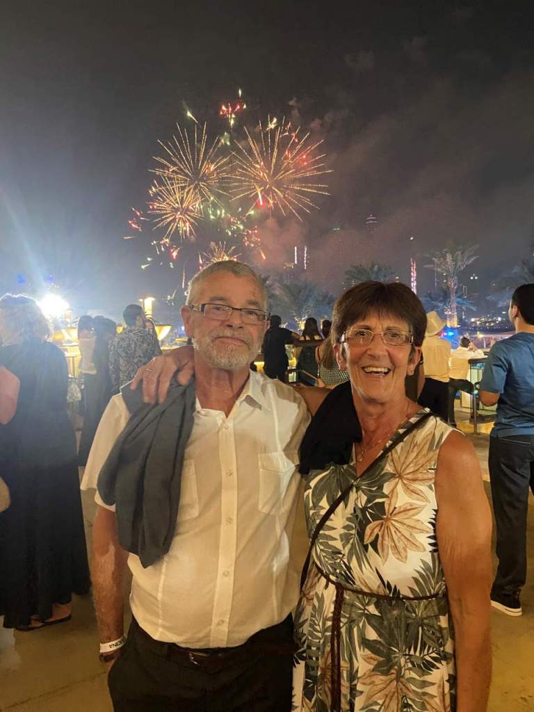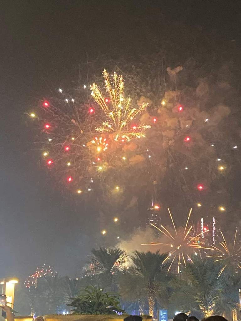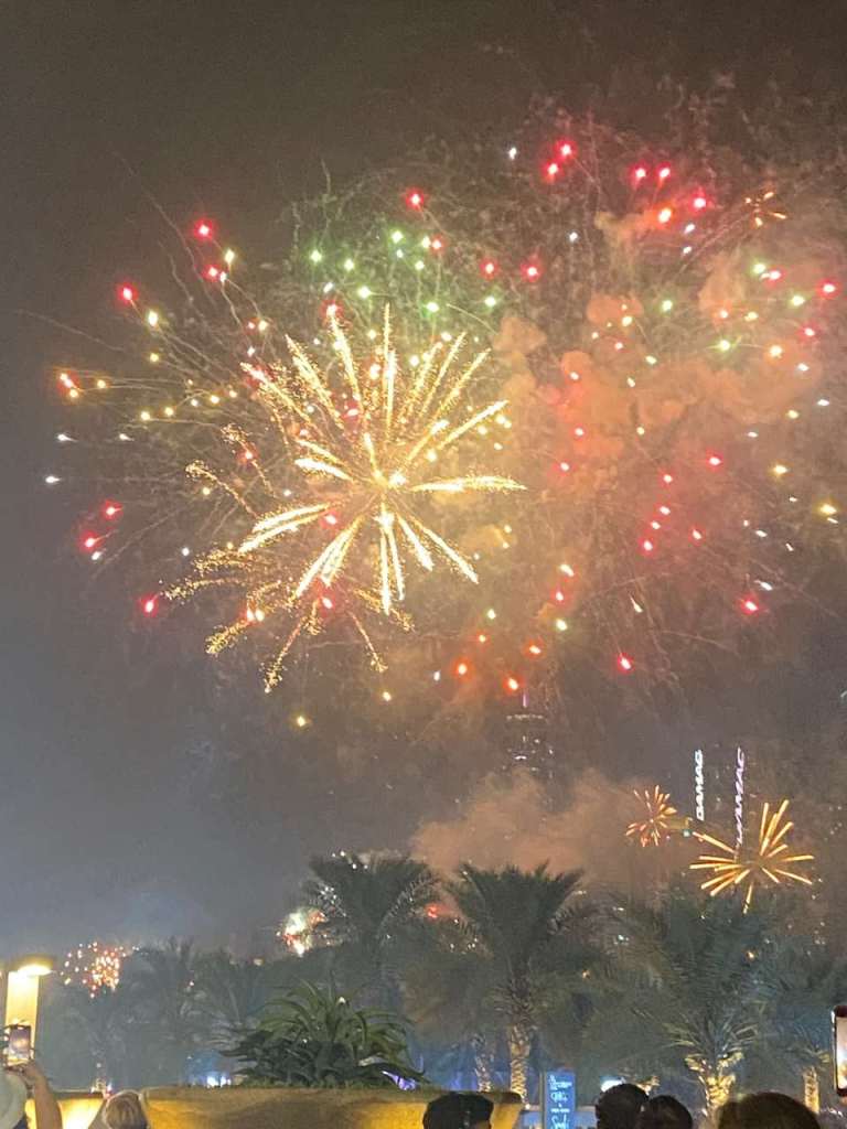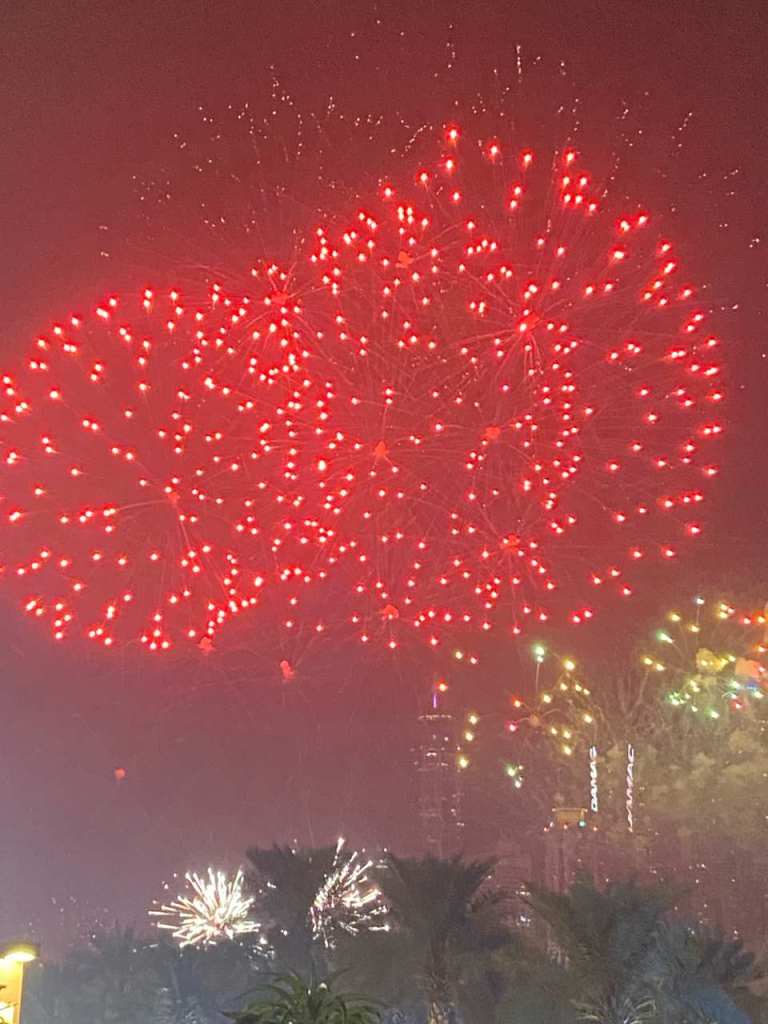 Wenige Minuten später gehen schon die ersten Raketen hoch, die meiner Ansicht nach in der Dubai Marina oder beim Riesenrad Ain Dubai gezündet wurden. So geht es vielleicht eine Viertelstunde lang, für eine Stadt wie Dubai hätte ich mir das vielleicht etwas länger vorgestellt. Aber vielleicht sind auch hinter unserem Rücken viele Raketen hoch gegangen, hier steht unser Marriot Resort ein Riesen Hotel mit seinen 13 Etagen.