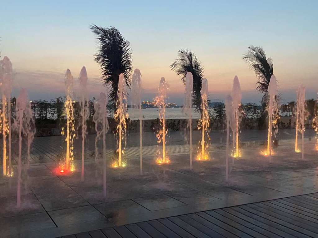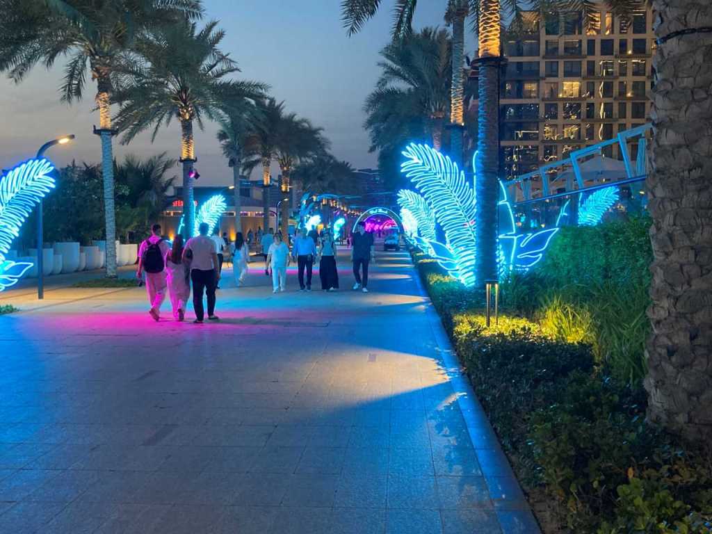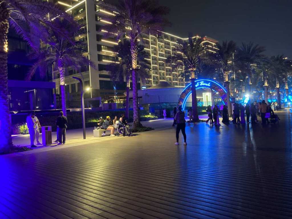 Nach dem Essen gehen wir auf der Promenade von Palm West Beach, die sich zwischen dem Hotel und dem Strand befindet spazieren. Unsere Tochter geht mit ihrem Sohn eine Runde mit, unser Schwiegersohn liegt alleine Krank im Zimmer. Auf Bluewater Island das einige Kilometer von uns entfernt ist, kann man die Beleuchtete Kulisse des 250 Meter hohen Riesenrades Ain Dubai sehen. Wie ich schon erwähnt habe, ist es kurz nach der Eröffnung im Jahr 2021 wieder wegen Instabilitäts-Problemen still gelegt worden. Nach meinen neuesten Informationen läuft der Ain Dubai seit Anfang Januar 2025 wieder.