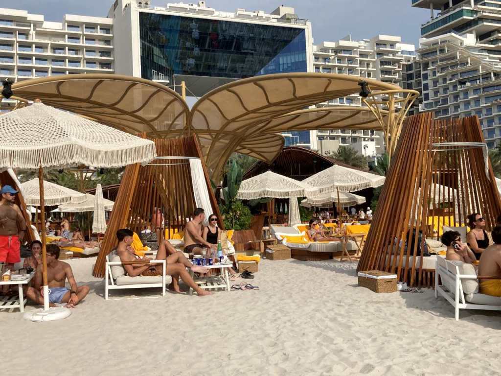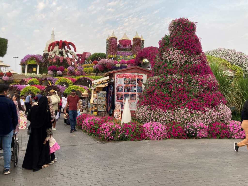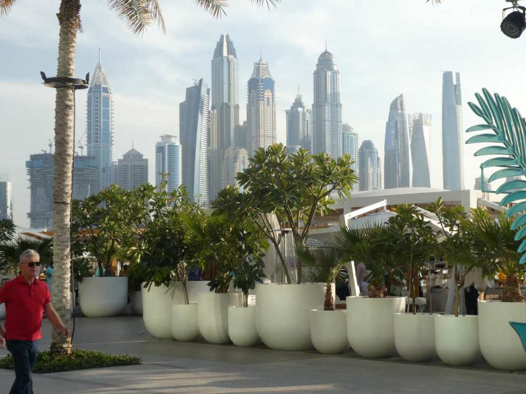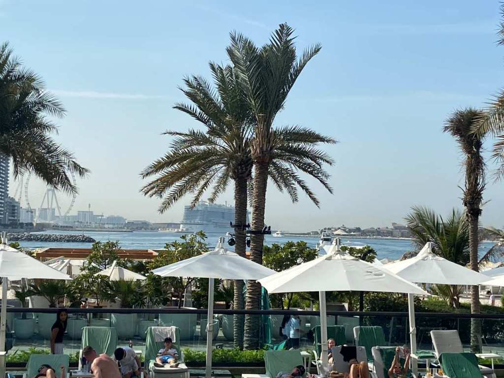 Es ist gleich Mittag, und unsere Jugend hat sich noch nicht sehen lassen. Wir genießen den letzten freien Tag hier am Pool. Heute Nachmittag wollten wir noch einen Ausflug zum Miracle Garden machen, zumindest war es so geplant. Aber zuerst müssen wir eventuell auch über WhatsApp etwas von unserer Jugend hören. Kurz nach 13:00 kommen sie am Pool vorbei. Gemeinsam verbringen wir den halben Nachmittag am Pool wie auch am Badestrand. Drüben am Kreuzfahrtterminal Dubai Harbour liegt als einziges Schiff noch die MS Celestyal Journey. Zwischenzeitlich machen wir ein letztes Mal einen Spaziergang über den Palm West Beach. Da wir geplant hatten heute noch den Miracle Garden zu besuchen, verlassen wir um 15:30 den Strand und machen uns im Zimmer für den Ausflug fertig. Unser Schwiegersohn bestellt das Taxi, wir hatten die vergangenen Tage immer wieder den gleichen Fahrer, da wir sehr zufrieden mit ihm waren. Heute Nachmittag fahren wir mit seinem Bruder, der bei den beiden immer die Tages-Schicht fährt.