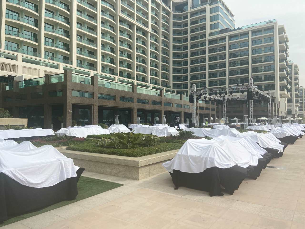 Wir genießen den warmen Abend und die hübsche Beleuchtung der Promenade. Am Strand befinden sich noch einige Bars und Restaurants. Mittlerweile ist es schon nach 21:00 und unser Kleiner Enkel sollte ins Bett, wir gehen zurück in unser Hotel. Auf der großen Terrasse zwischen dem Hotel und dem Pool haben die Mitarbeiter Tische und Stühle sowie Gläser und Besteck für die morgige Sylvester-Gala-Menü aufgestellt. Und hinterher wird alles mit großen weißen Tüchern abgedeckt.
