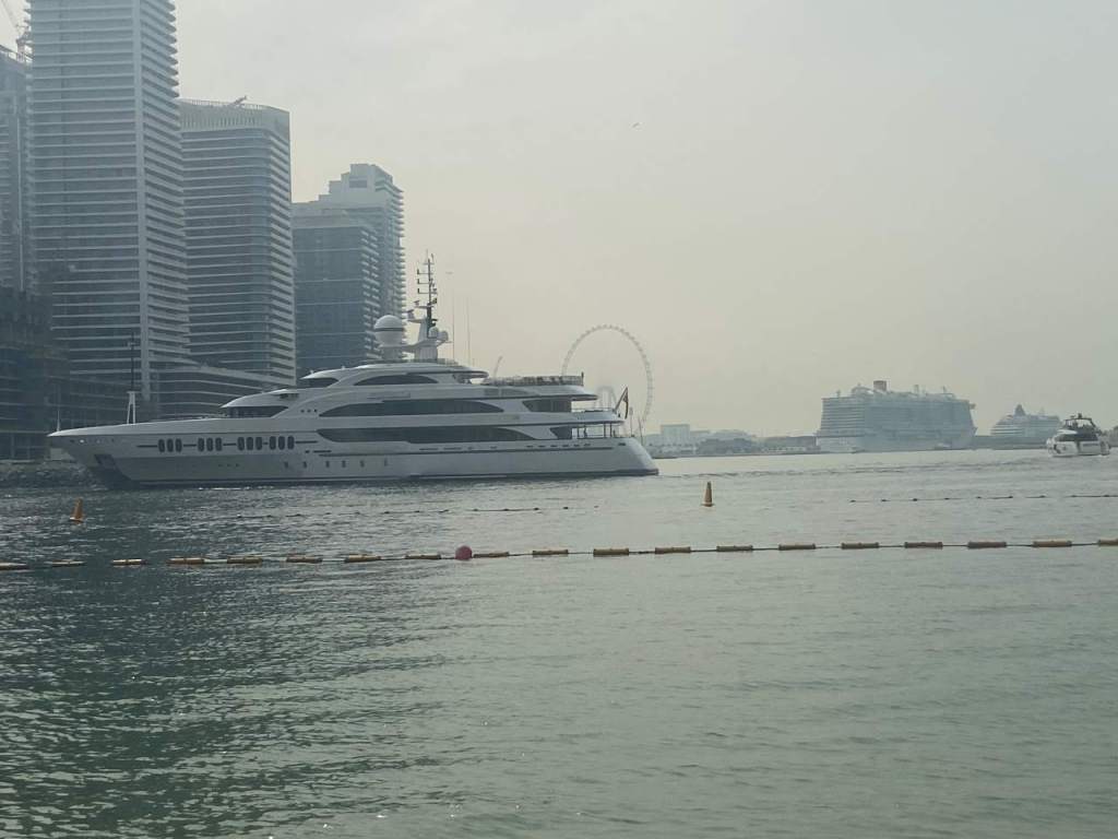 Am Ende des Hafens fahren wir an einer riesigen Yacht vorbei, wenig später können wir Ihren Namen lesen. Es ist die Yacht Dubai, der Besitzer der 162 m langen Luxusyacht ist der Scheich von Dubai Muhammad bin Raschid Al Maktum. Wenig später fahren auch an der Queen Elisabeth 2 die seit 2018 hier am Yachthafen Mina Rashid als Hotelschiff steht.