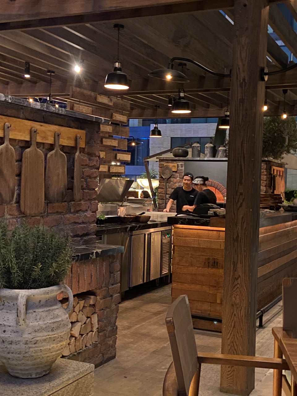 Kurz vor halb Acht Uhr sind wir schon wieder in unserem Hotel zurück, hier stellt sich der Hunger bei einigen in unserer Gruppe ein. Wir gehen in das Italienische Restaurant Cucina wo wir den gestrigen Abend verbracht haben. Allerdings setzen wir uns heute auf einen der Tische im äußeren Bereich. In nächster Nähe von uns befindet sich ein Steinofen in dem die Pizza gebacken wird. Die meisten von uns haben Appetit auf eine Pizza, aber jeder hat auch seinen eigenen Geschmack. Ich nehme nur eine Pizza mit Schinken eventuell mit Salami aber in jedem Fall mit Pilzen (Funghi). Die Damen bestellen eine Pizza mit Ruccola. Welche mein Schwiegersohn bestellt, weiß ich gar nicht mehr. Wir Männer trinken ein Bier dazu, meine Frau ein Glas Rotwein, und meine Tochter die ein Kind bekommt trinkt Wasser. Nach ca. 20 Minuten sind die Pizzen fertig und bei uns am Tisch. Kurz gesagt die Pizzen schmecken vorzüglich auch unserem kleinen Mann, der eine Kinderpizza bekommen hat schmeckt sie allen Anschein nach. Kurz nach 21:00 brechen wir wieder auf, um auf unsere Zimmer zu gehen. Am nächsten Morgen müssen wir leider sehr früh raus, und mit einem Taxi zum DXB Flughafen fahren. Er ist etwa 30 Kilometer entfernt. Wie der Autoverkehr zu dieser frühen Uhrzeit ist. können wir leider nicht einschätzen.